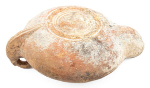 Group of Four Ancient Pottery Vessels, comprising: pinch lip pot, red jar, Holy Land oil lamp with olive leaf motif, Persian tripod footed vase. Vase: 4.5" H x 5" Diameter. Provenance: From a 33 East End Avenue Estate. Keywords: Artifacts, Antiquities,Terracotta, Clay, Censer, Giyan Tepe, Roman, Curios, Wunderkammer, Decorative Arts