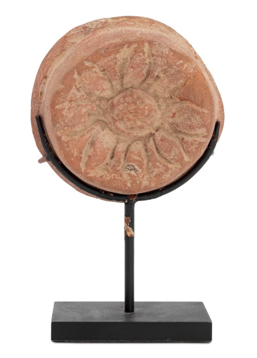 Collection of Three Pre-Columbian Pottery Articles, comprising: lower relief round figural scene with ebonized metal stand, pottery chupicuaro figure, and terracotta carved bird face. Largest: 4" H x 1.5" W x 0.75" D. Provenance: From the Upper East Side Apartment of a Former Ambassador. Keywords: Ceramics, Clay, Artifacts, Figural, Figurative, Portrait, Female figure, Female form, Animalier, Antiquities, Curios, Decorative Arts