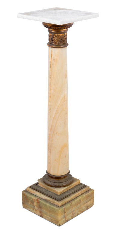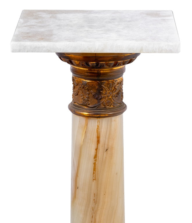 French Gilt Metal Mounted Alabaster Pedestal, late 19th century, with a later square top on a tapering column and stepped square plinth. 41.5" H x 11" W x 11" D. Keywords: Antique Furniture, Base, Display stand, Plant stand, Sculpture gallery, Column, Plinth, Carved stone, Interior design, Decorative Arts