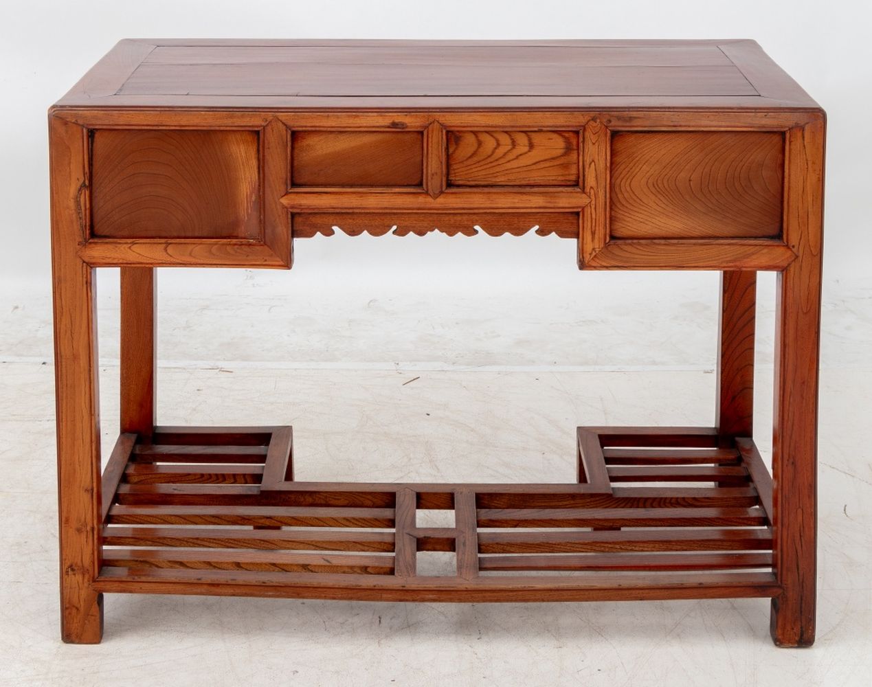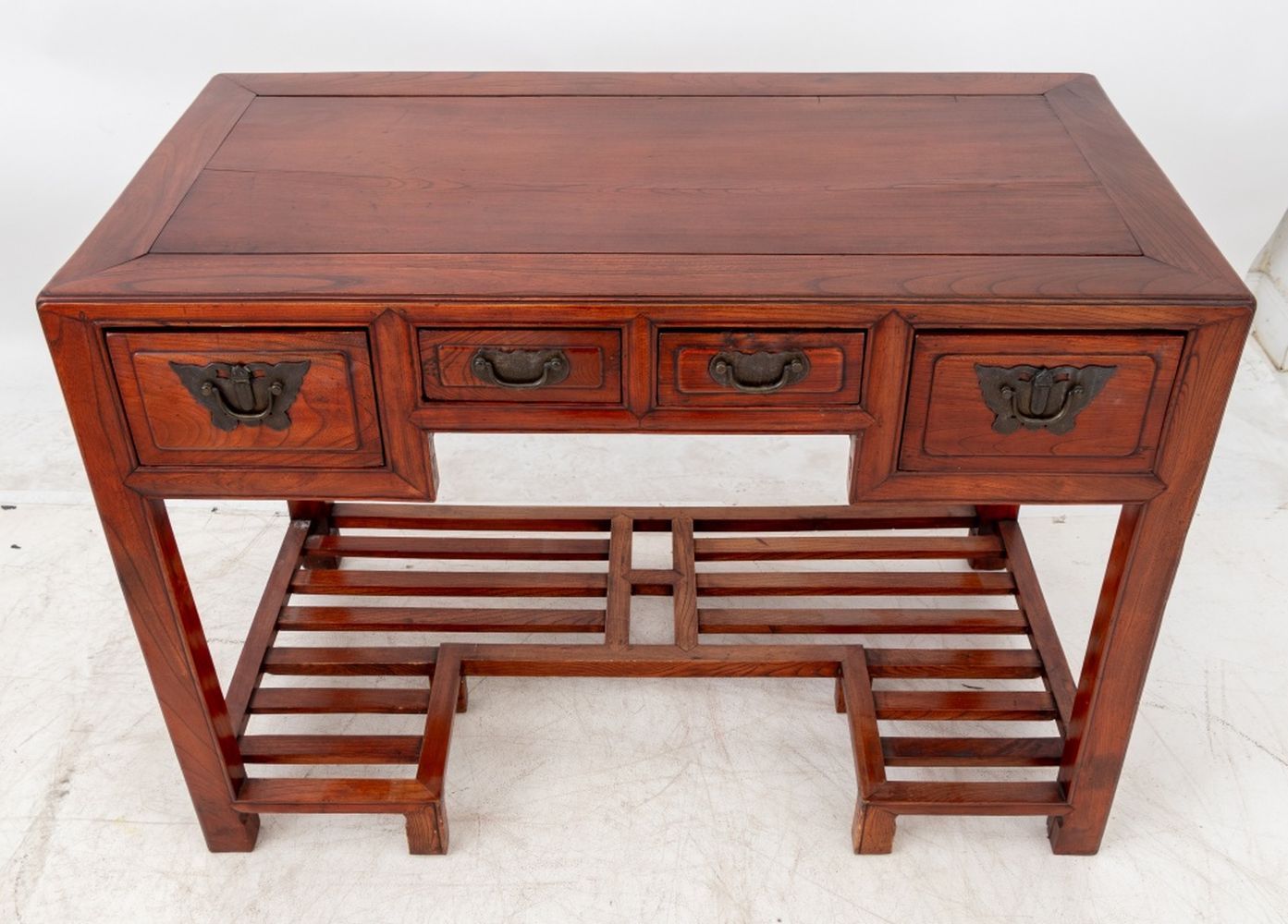 Chinese Elm Writing Desk, 19th century, having four drawers with brass butterfly form drawer pulls and lattice paneled stretcher. 33" H x 44.5" W x 23" D. Provenance: From a West 12th Street Estate. Keywords: Antique Furniture, Asian Furniture, China, Work surface, Hardwood, Bureau, Writing table, Interior design, Decorative Arts