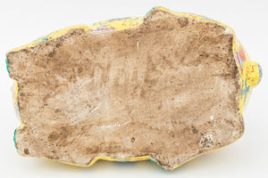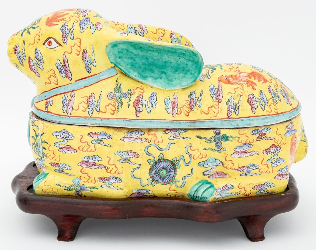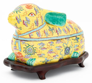 Chinese Rabbit Form Famille Jaune Porcelain Covered Tureen, hand-painted with foo lions amongst clouds, on a fitted carved wood stand. Overall: 11" H x 15" W x 8.5" D. Provenance: From a Greenwich, Connecticut Collection. Keywords: Asian Arts, China, Ceramics, Hand-enameled, Yellow ground, Hare, Animalier, Vessel, Decorative Arts