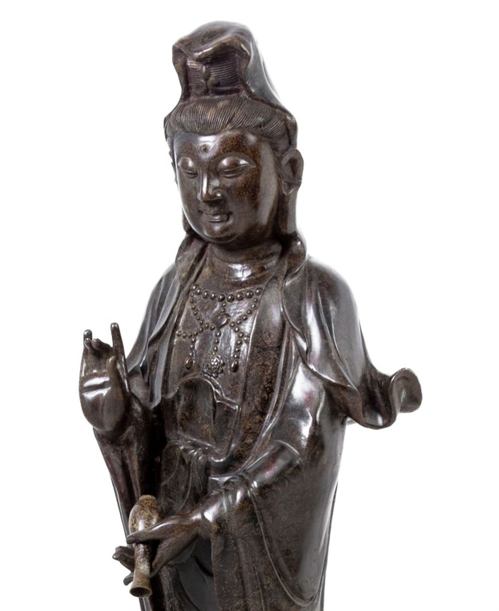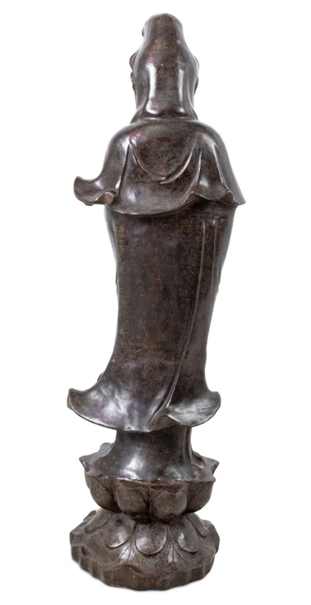 Chinese Standing Guanyin Patinated Bronze Sculpture, the bodhisattva donning floral pattern robes and holding an articulated vase, atop a double lotus base. 47" H x 14" W x 13" D. Keywords: Asian Art, China, Sculpture, Bronzier, Antique, Religious Art, Buddhism, Buddhist, Deity, Figural, Figurative, Decorative Arts