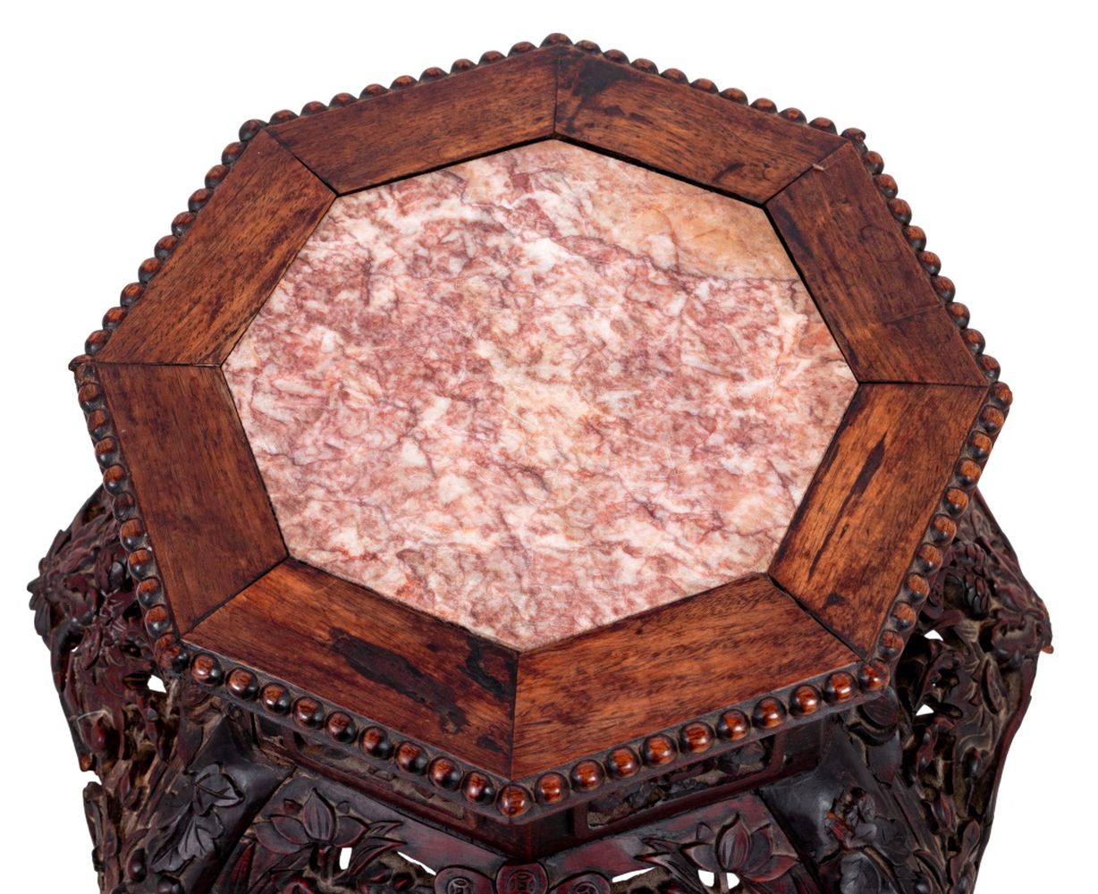 Chinese Carved Hardwood and Marble Pedestal Table, late 19th century, the octagonal inset marble top above an intricately carved frieze, on scrolled legs joined by an X-form stretcher. 25" H x 17" W x 17" D. Keywords: Asian Arts, Antique Furniture, Lamp table, Side table, Display stand, Sculpture gallery, Plant stand, Interior design, Decorative Arts