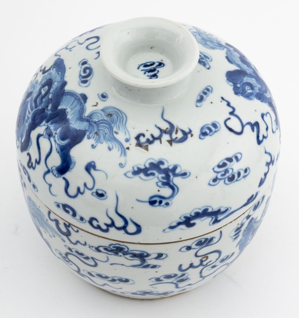 Chinese Blue and White Porcelain Covered Bowl, probably Qing Dynasty, with dragon motif and cup form finial. 7.5" H x 7" Diameter. Provenance: From the Collection of a New York City Musician. Keywords: Ceramics, Asian Arts, China, Vessel, Container, Lidded bowl, Glazing, Cobalt blue, Decorative Arts, Antique