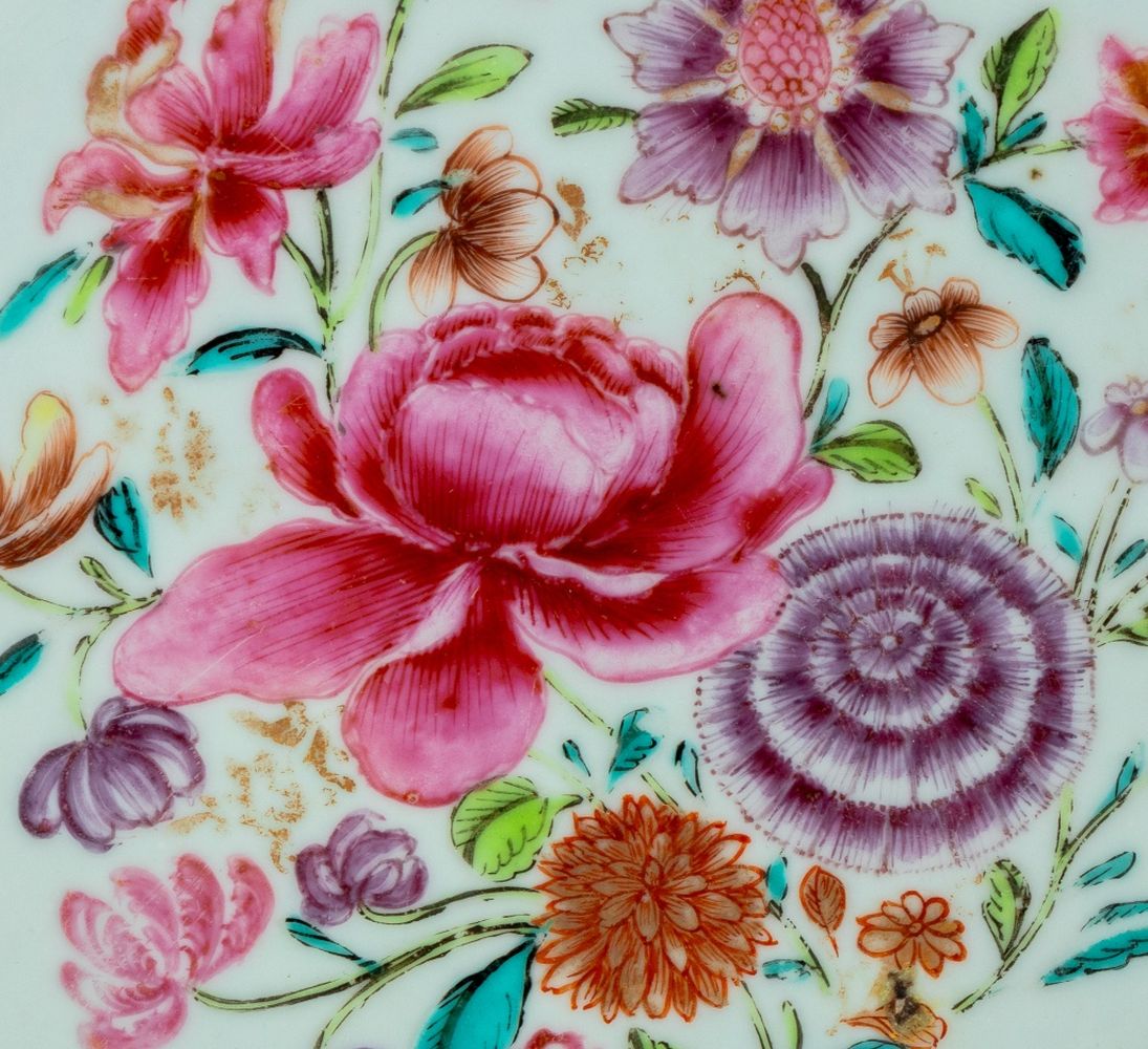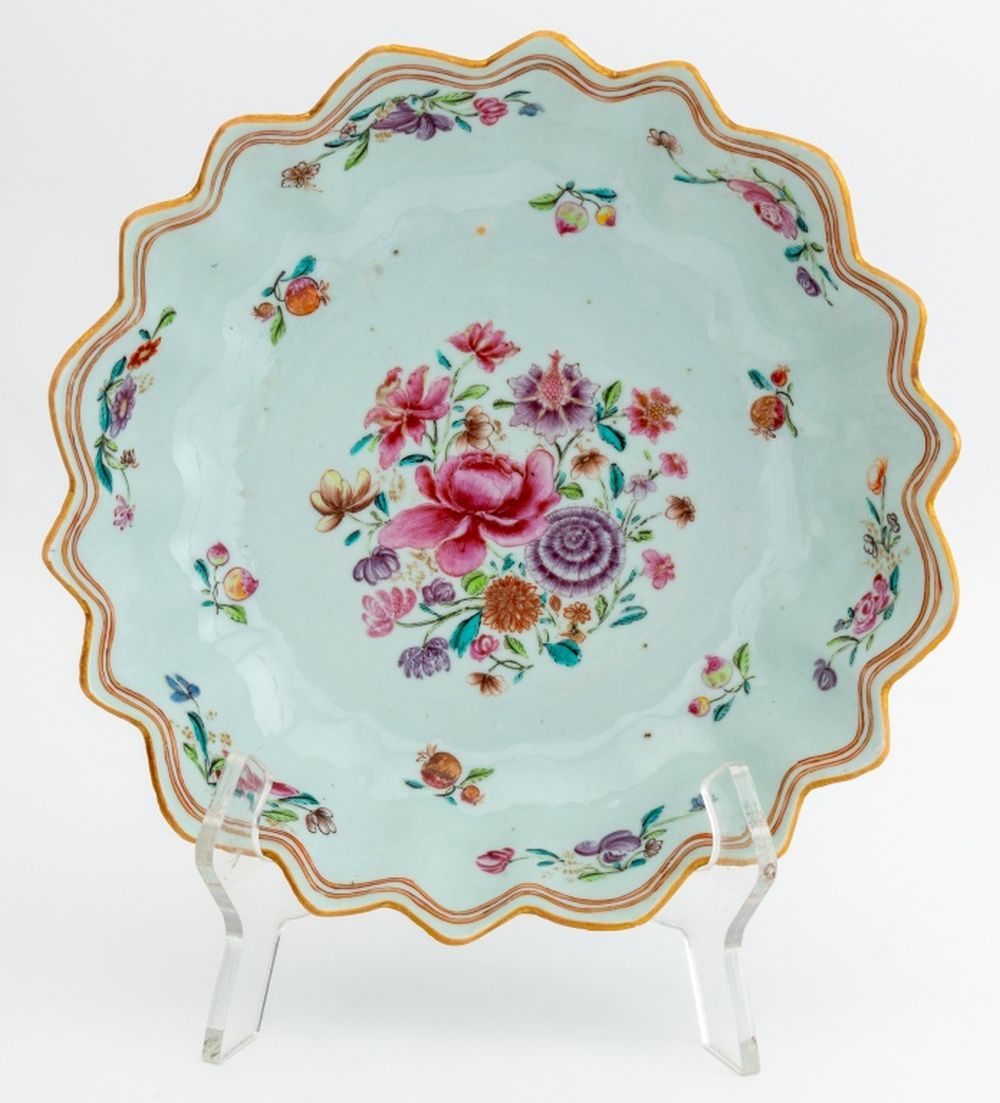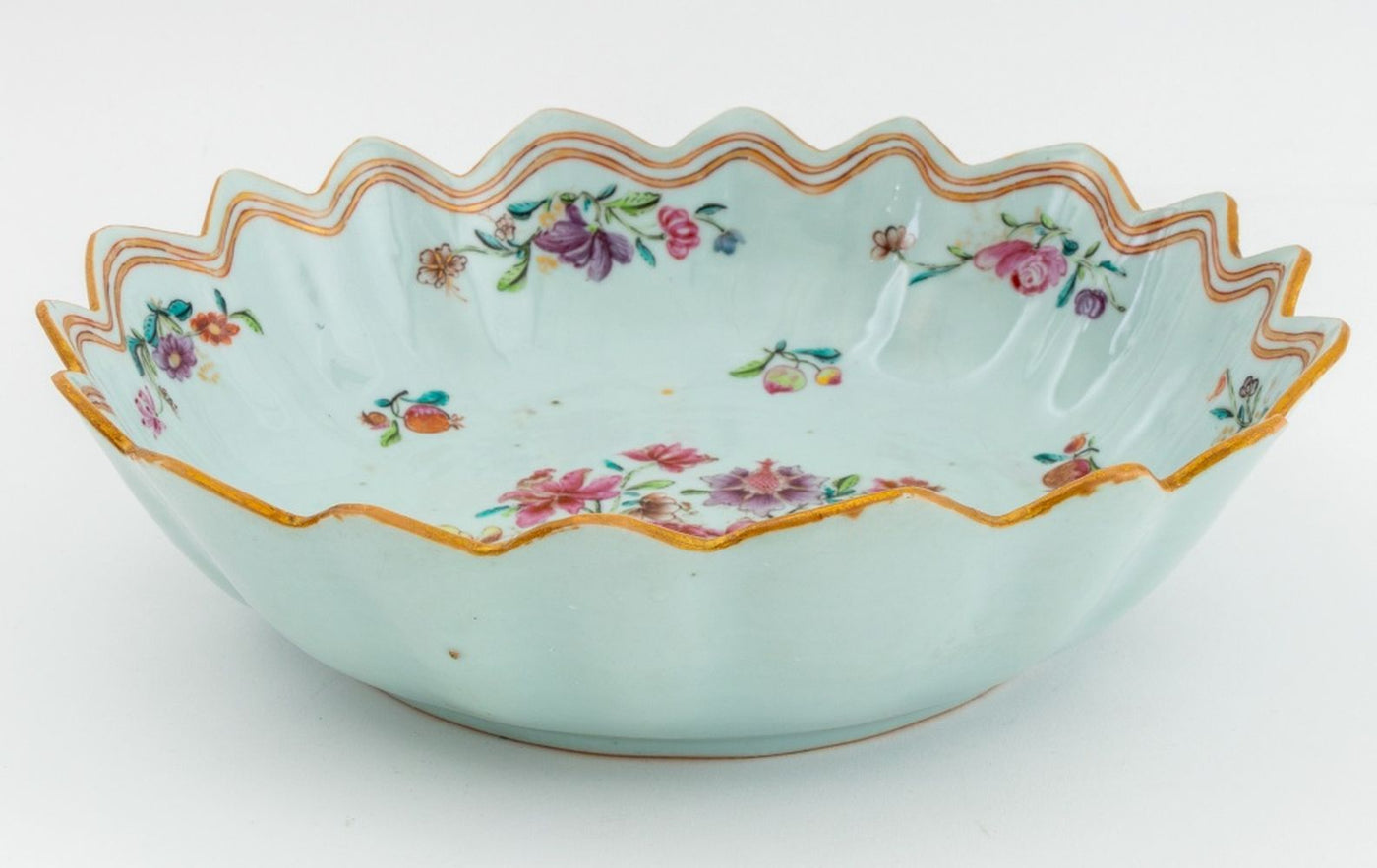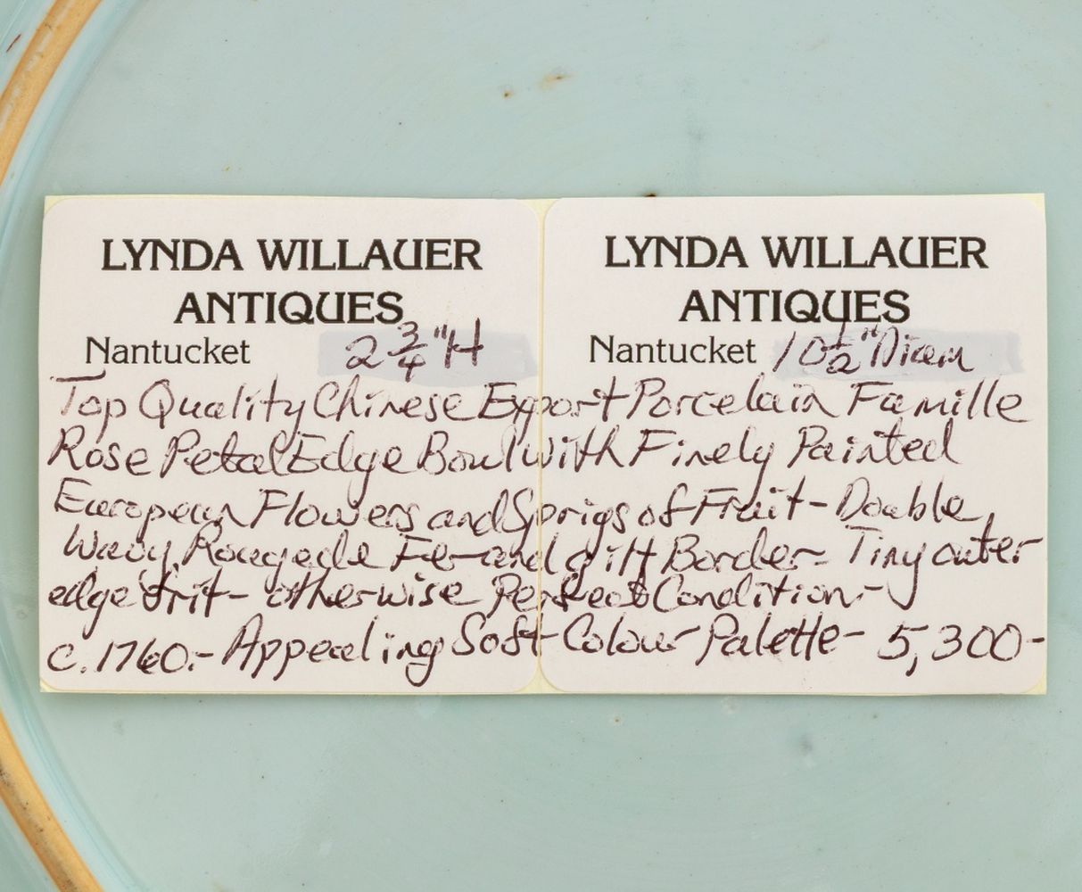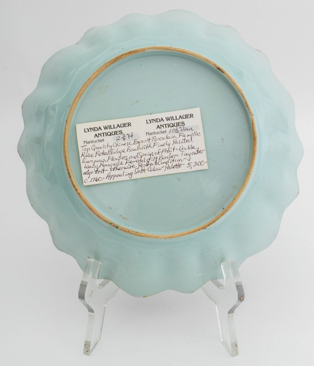 Chinese Export Famille Rose Porcelain Lobed Bowl, Qianlong Period, circa 1760, with hand-painted floral and fruit motif and label to underside. 10.25" Diameter x 2.75" H. Provenance: Lynda Willauer Antiques, Nantucket, MA. From a Palm Beach Collection. Keywords: Asian Arts, China, Ceramics, Tray, Meat platter, Display dish, Vessel, Flowers, Gilt accents, Scalloped edge, Petal edges, 18th Century, Qing Dynasty, Antique, Decorative Arts