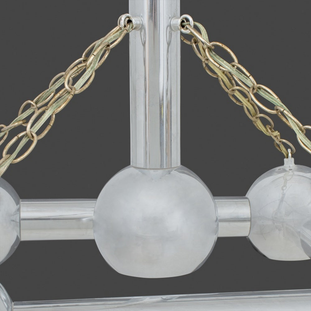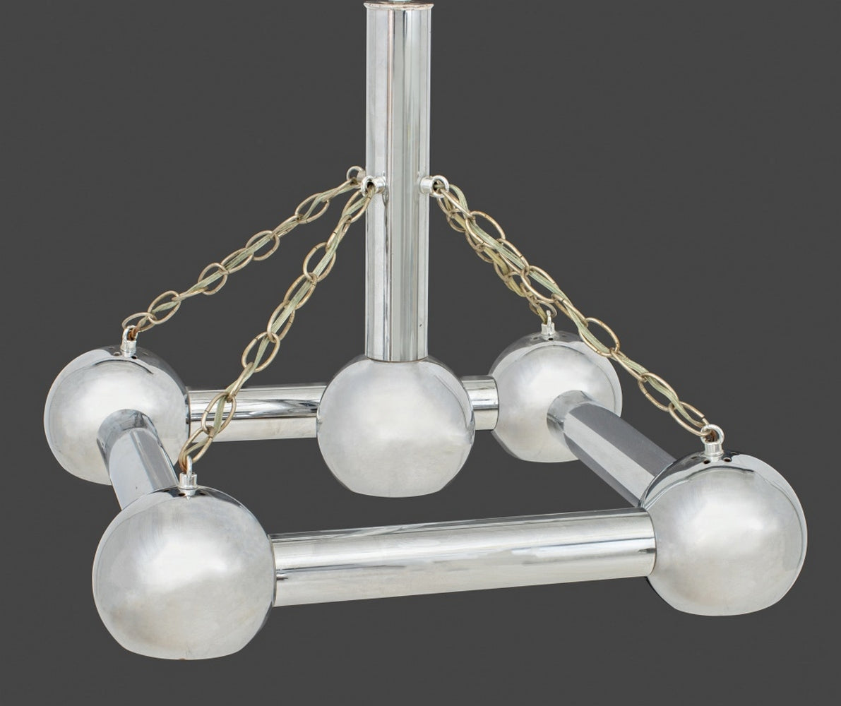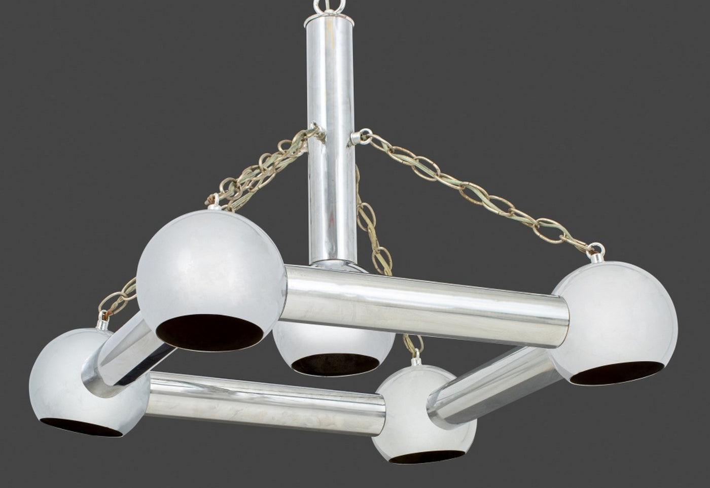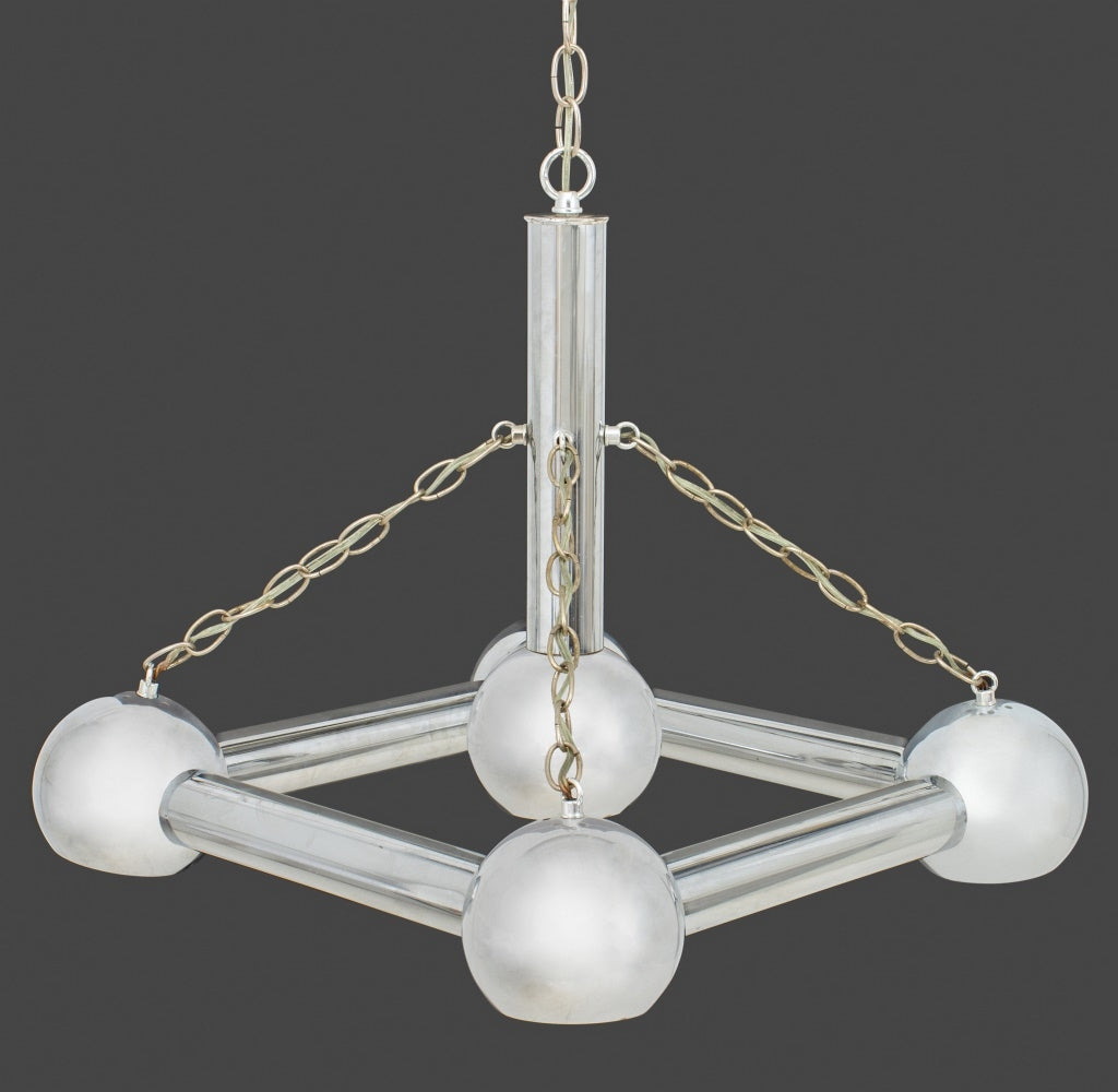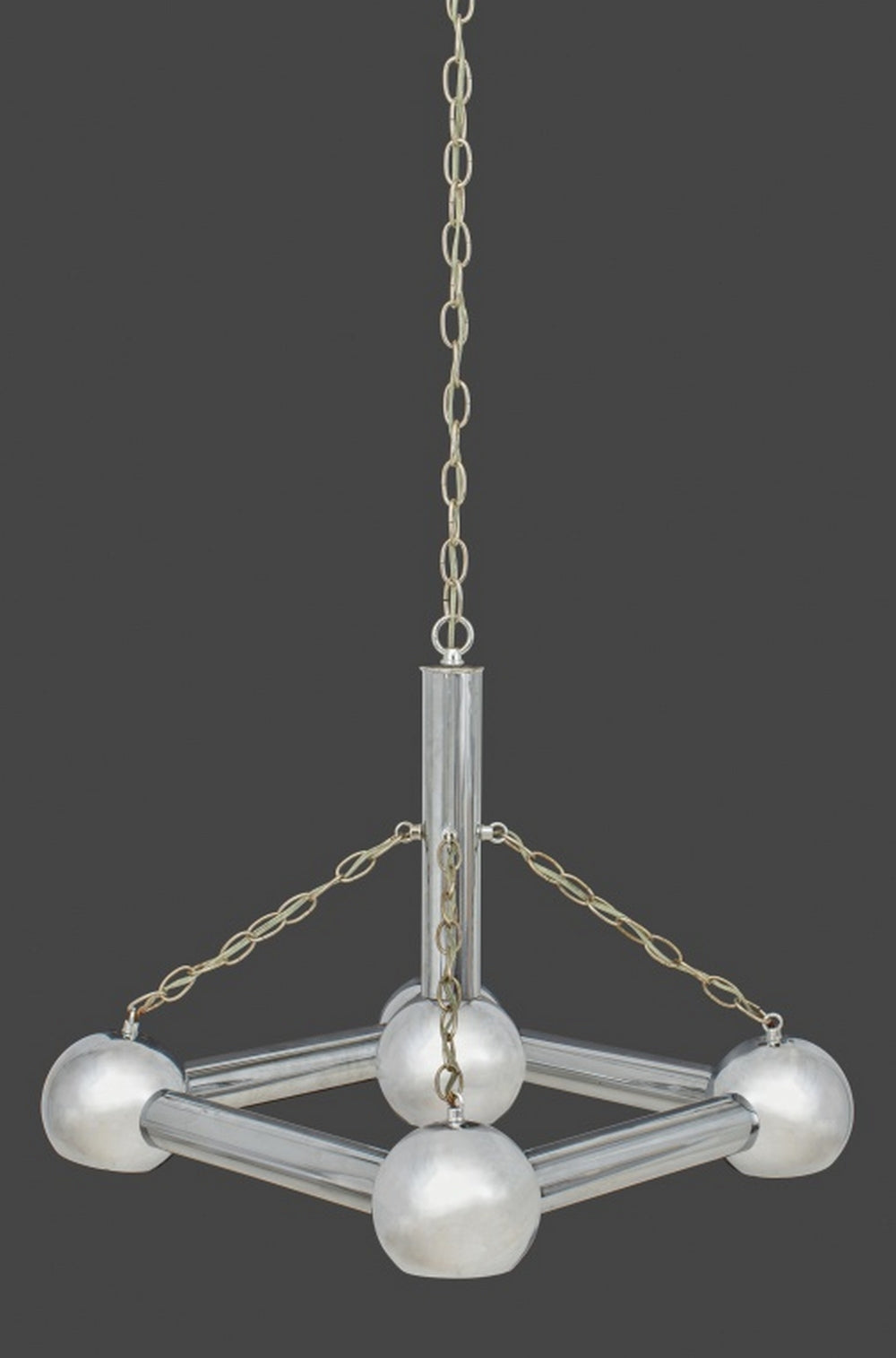 Gaetano Sciolari Style Tubular Chrome Five-Light Chandelier, circa 1970. 17.5" H x 20" W x 20" D. Provenance: From a New York City Collection. Keywords: Lighting, Pendant lamp, Hanging ceiling light, MCM, Mid-Century Modern, Modernist, Modernism, Vintage, Interior design, Decorative Arts