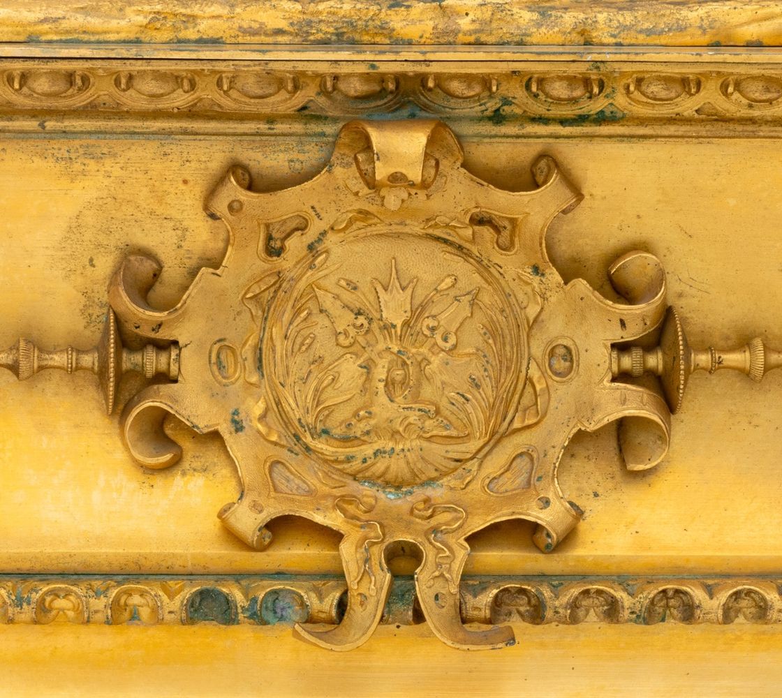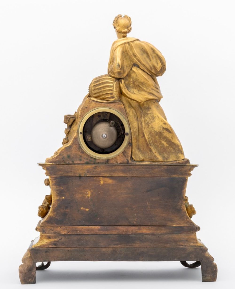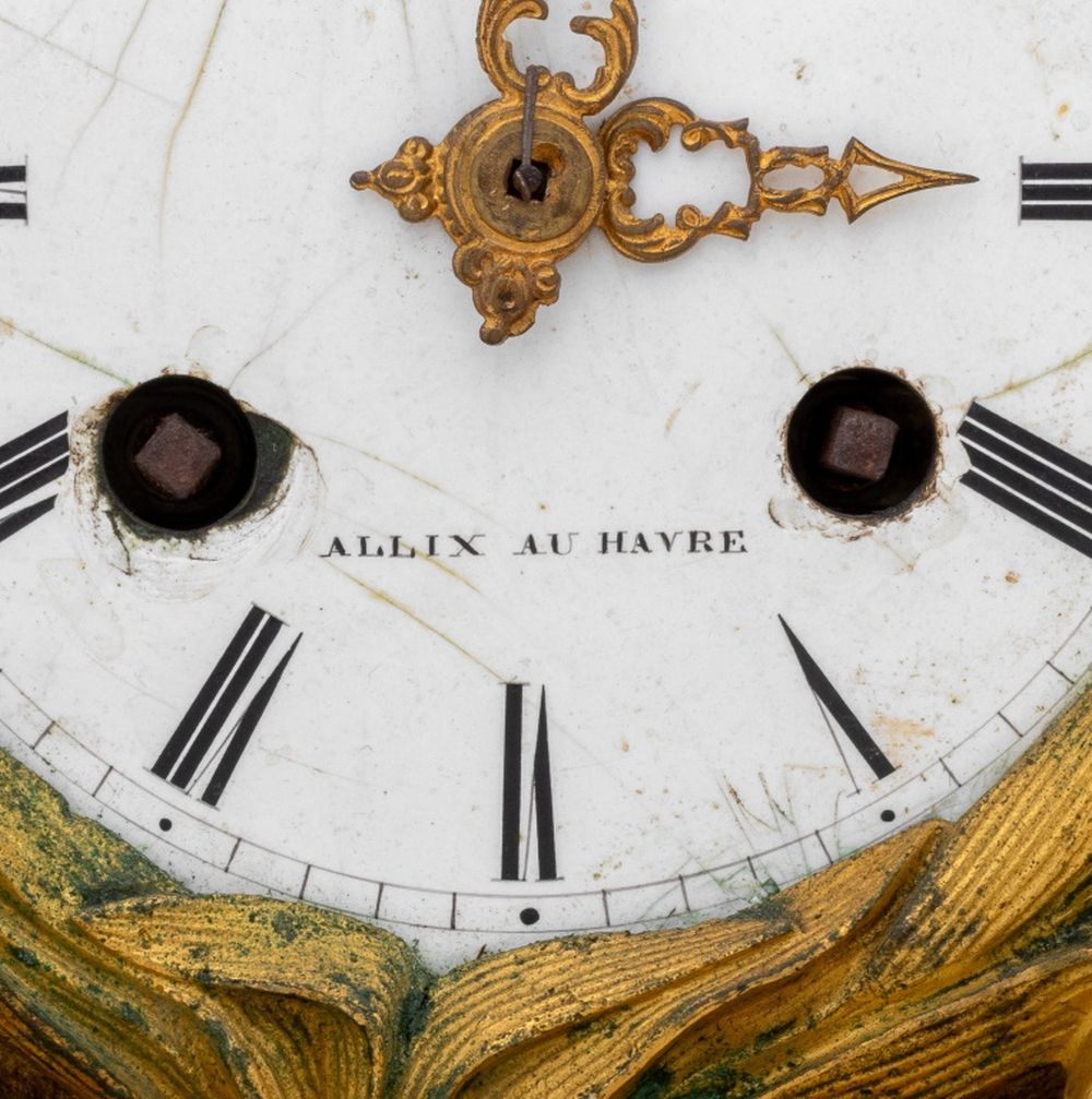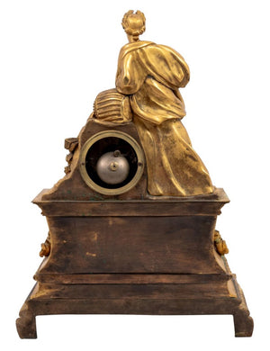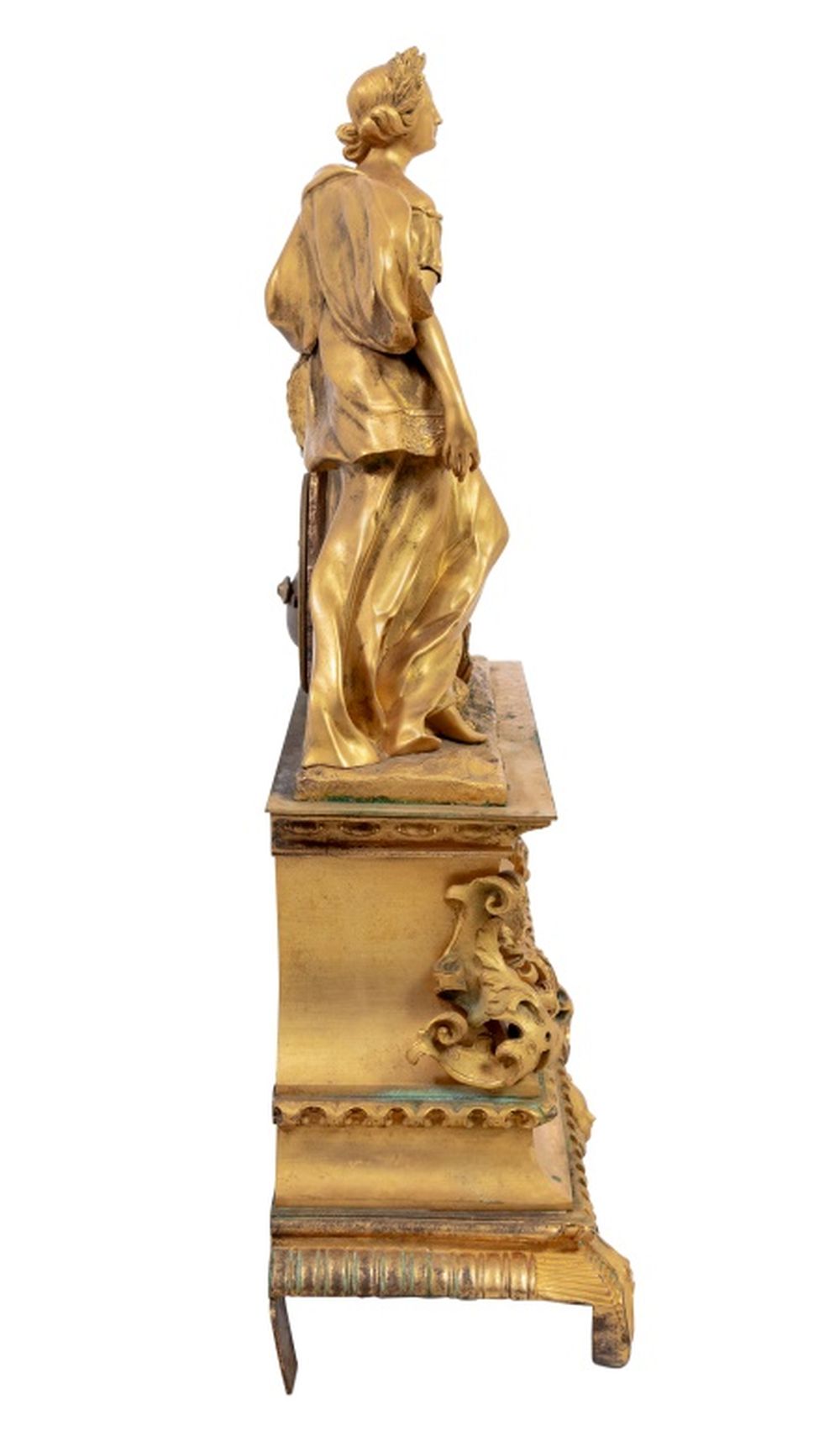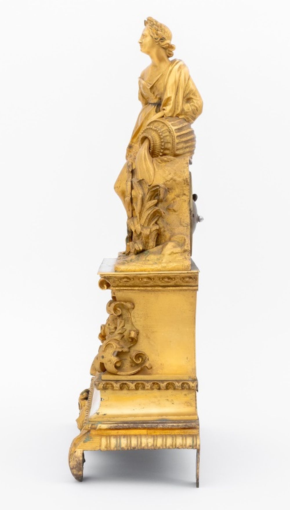 French Empire Gilt Bronze Figural Clock, circa 1830, the white enamel dial and movement strik on bell surmounted by a standing classical figure resting on an amphora pouring water, dial signed "Allix Au Havre" on a Gothic strapwork mounted base. 21" H x 15" W x 6" D. Keywords: Mantel Clock, Horologe, Horology, Timepiece, Time keeping, Ormolu, Roman, Greek Mythology, Hebe, Interior Decor, Decorative Arts