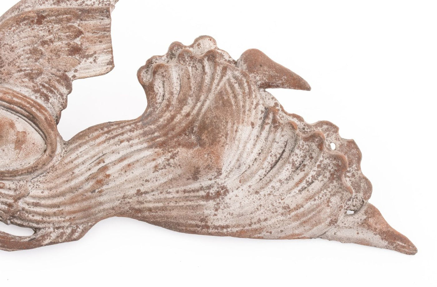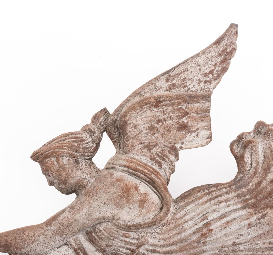 Pair of American Folk Art Cast Iron Winged Victory Figures, 19th century, each showing a flying Nike bearing a laurel victory crown aloft. 8" H x 17" L. Provenance: From a New York City Collection. Keywords: Statue, Sculpture, Metalwork, Figural, Figurative, Angelic, Antiques, Decorative Arts