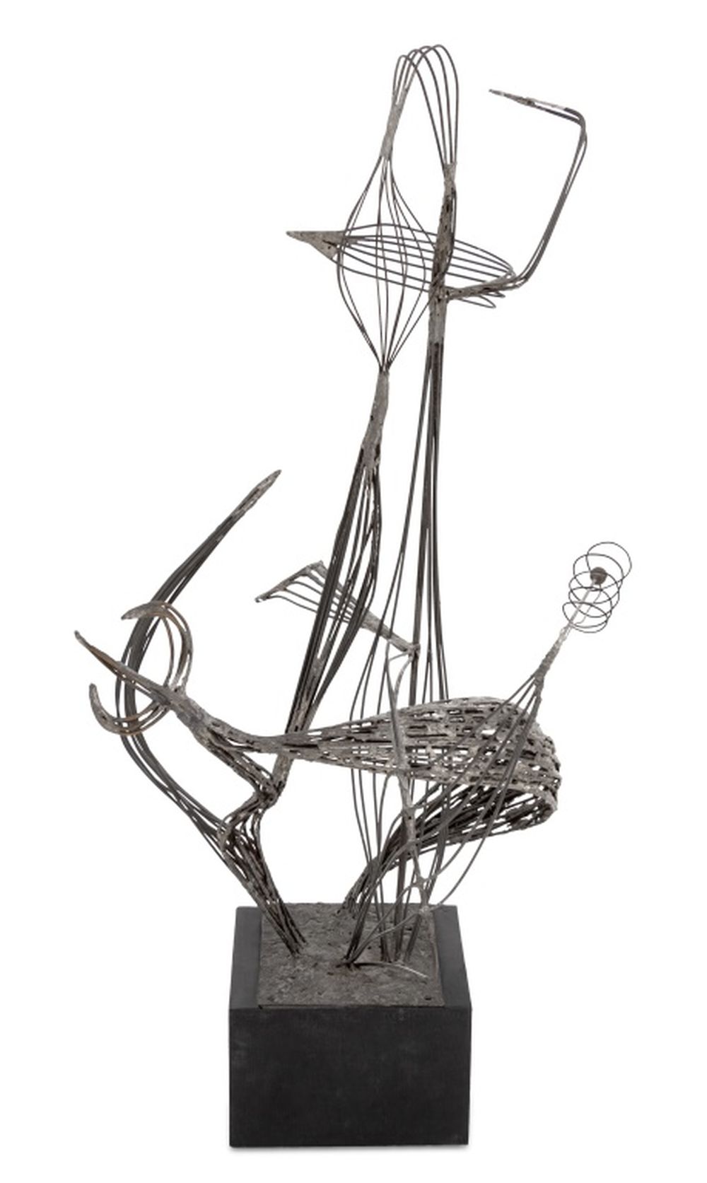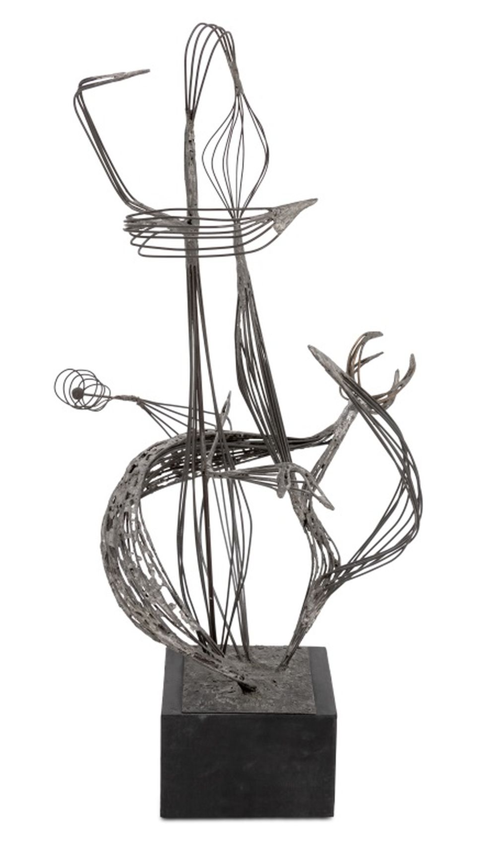 American School Abstract Floral Wire Sculpture, late 20th century, mounted on wood base. 36.5" H x 20.5" W x 16" D. Provenance: From a 5th Avenue Estate. Keywords: Statue, Metalwork, Sculptural, Linear, Flower, Foliate, Contemporary Art, 20th Century School, Decorative Arts