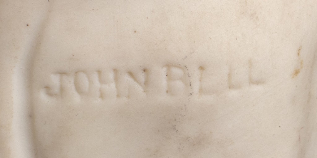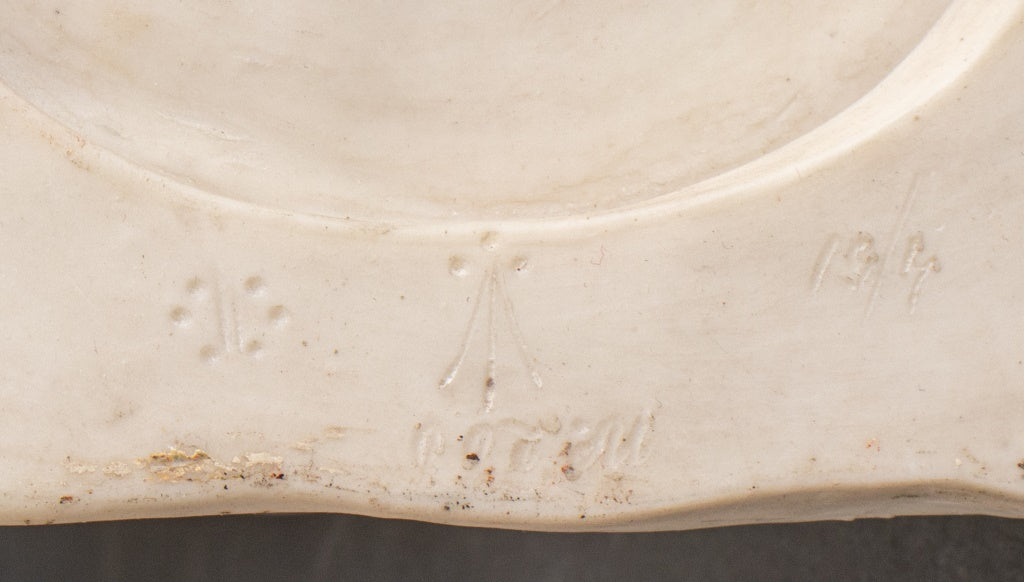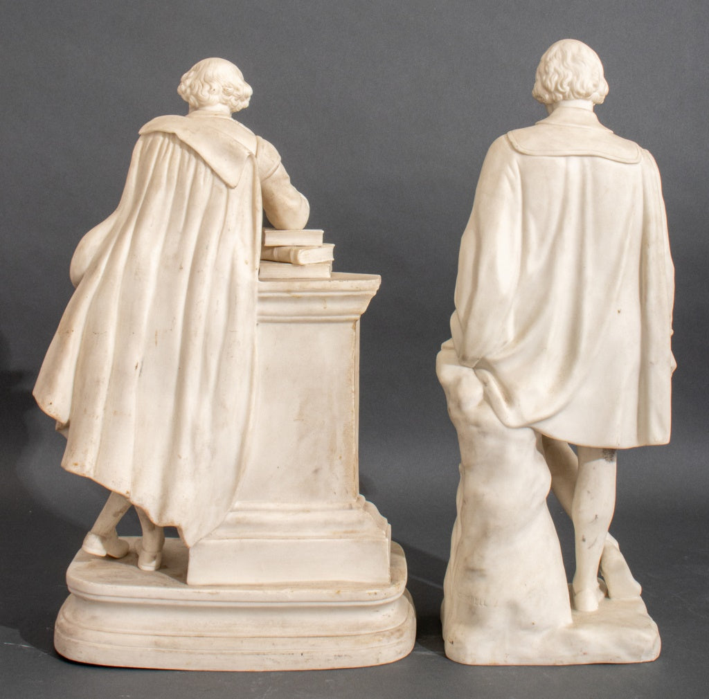 Two Parian Ware William Shakespeare Sculptures, circa 19th century, one figure standing beside an ivy-covered tree stump and with impressed "13/31" and maker's marks to underside, and one leaning on a stack of books atop a pedestal, with impressed "B" to underside. Larger: 17.5" H x 10" W x 5.5" D. Provenance: From an Upper West Side estate located at the Ansonia. Keywords: Antique, Ceramic, Statue, Figural, The Bard, English, British Art