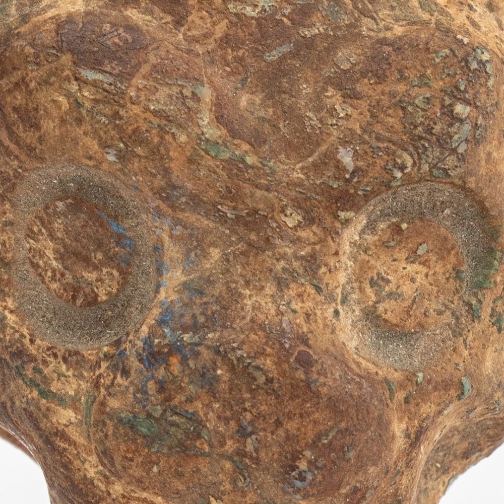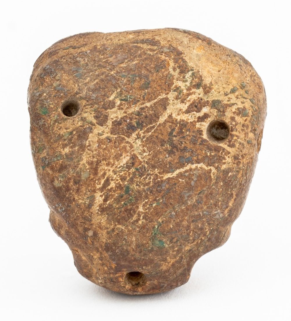 Pre-Columbian Jaguar Head Pottery Pendant, with traces of green glaze. 2" H x 2" W x 1" D. Provenance: From a New York City Collection. Keywords: Central American Arts, Sculpture, Statue, Figurine, Pottery, Clay, Earthenware, Antique, Antiquity, Antiquities, Artifact, Jewelry, Amulet, Feline, Big Cat, Animalier, Mexico, Mexican, Snarling, Roar, Curio cabinet accessories, Wunderkammer, Decorative Arts