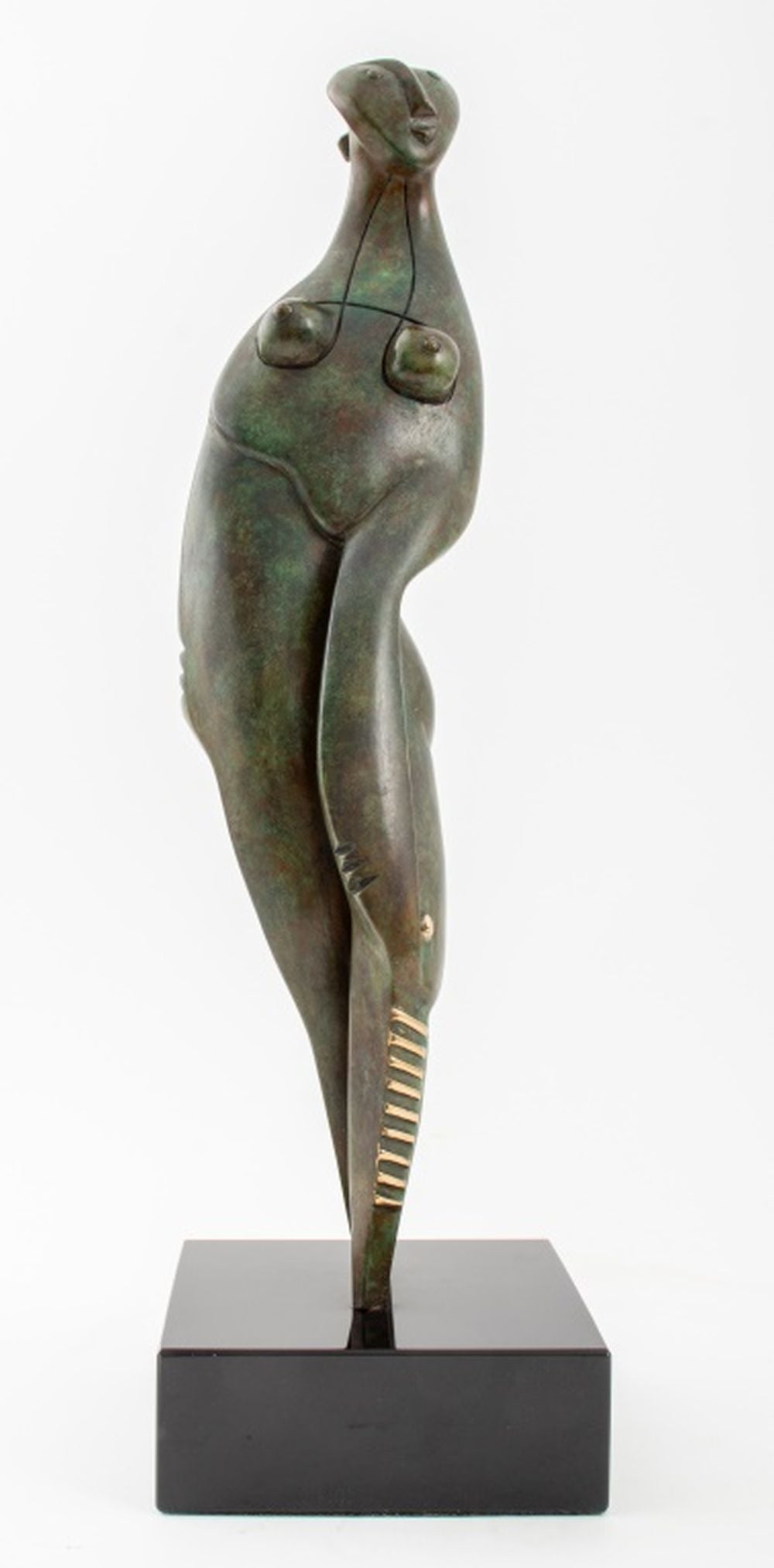 Ronald K. Parker (American, b. 1939) "Life", Verdigris Patinated Bronze Sculpture, 1999, signed "Parker" and marked "c 99 26/99" to leg. 18" H x 5.25" W x 5.25" D. Provenance: From the collection of the publisher. Keywords: Statue, Modern, Abstract, Abstraction, Female figure, Figural, Woman, Tabletop sculpture, Contemporary Art, Decorative Arts