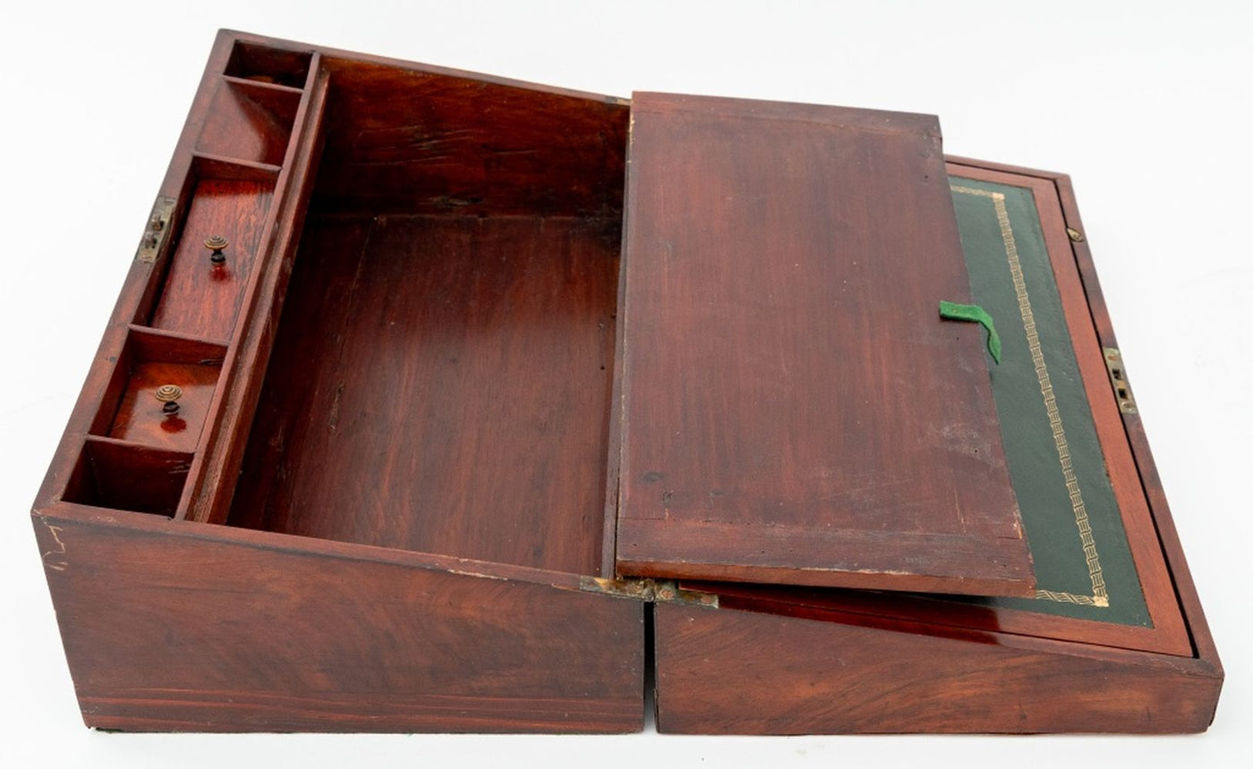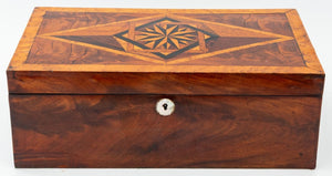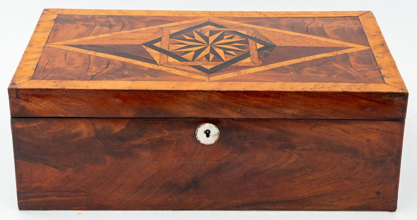 American Marquetry Writing Box, 19th century, the top with geometric starburst inlay of maple, ebony, rosewood, and burl wood and opening to writing slope with gilt-tooled green leather surface and storage compartments, with mother-of-pearl lockplate. Closed: 6.75" H x 18.25" W x 10" D. Provenance: From a Greenwich, Connecticut Collection. Keywords: Federal Period, Inlay, Woodwork, Hinged box, Travel desk, Writing surface, Antique, Decorative Arts