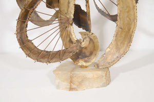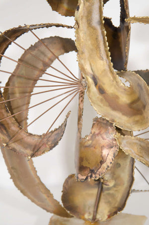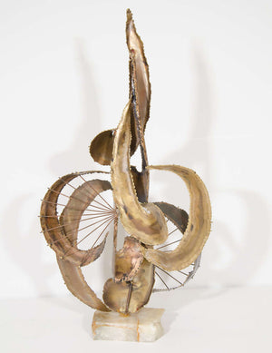 A vintage mixed metal sculpture in the brutalist style of Curtis Jere with alabaster base.