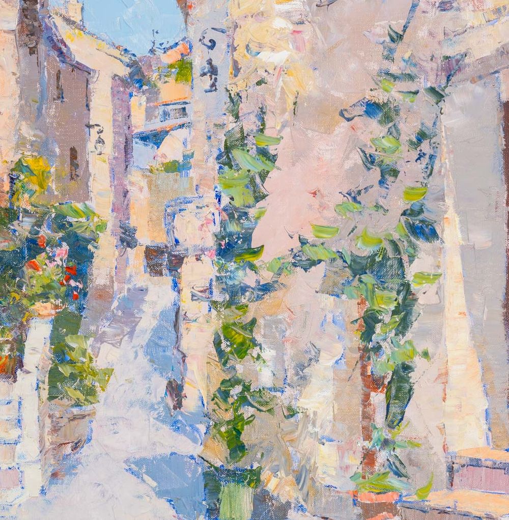 Pierre Bittar (French, b. 1934), "Village Mediterranee", Oil on Canvas, signed lower right, Wally Findlay Galleries label to verso, giltwood frame. Image: 31.25" H x 25" W; frame: 39.5" H x 33" W x 2" D. Provenance: From an Upper East Side Estate. Keywords: Painting, Oil painting, Works on Canvas, Street Scene, Cityscape, Town, Mediterranean, Pastel palette, Soft, Impressionistic, Post-Impressionism, 20th Century School