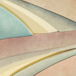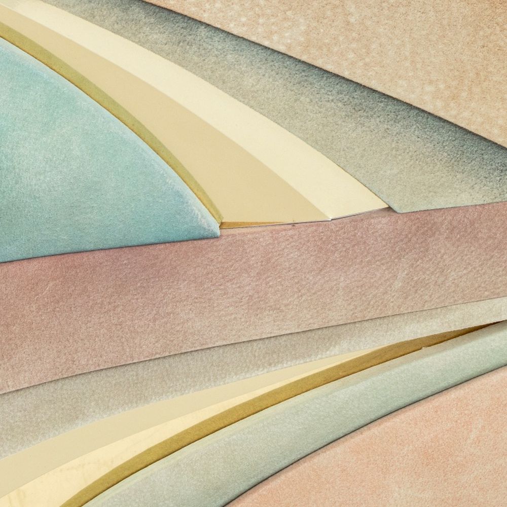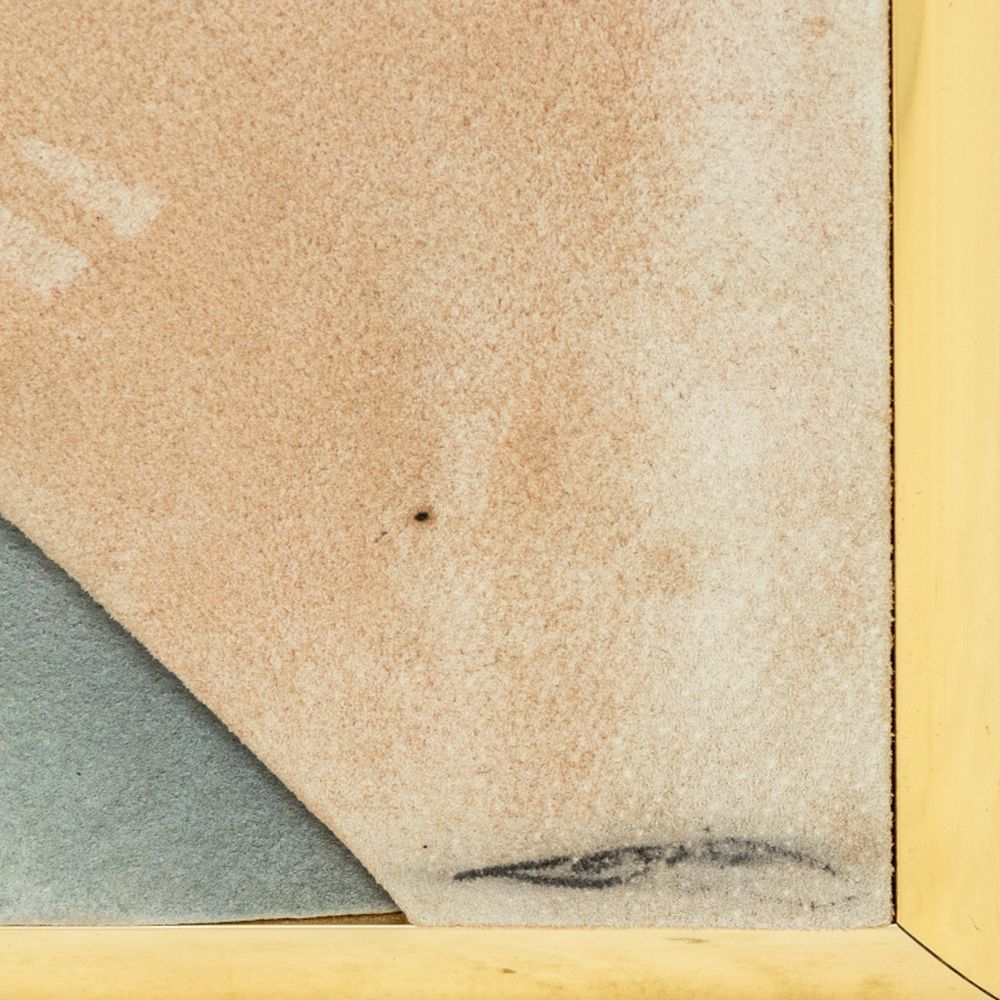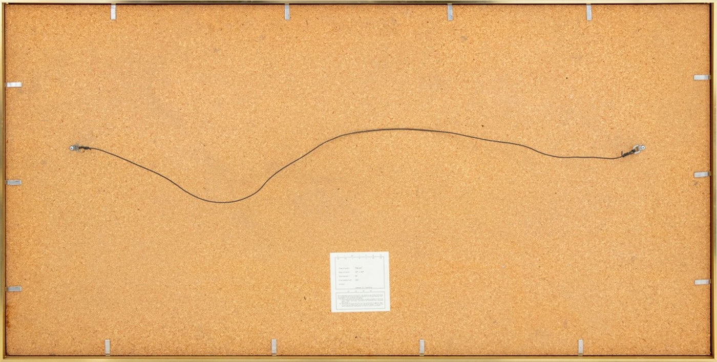 Steven Corning (American, XX) "Helia", Mixed Media Suede Sculpture, blue and purple-tone suede over raised forms, signed lower right, label to verso, gold-tone metal frame. Image: 30" H x 60" W; frame: 32" H x 62" W. Property from the Long Island residence of a collector and longtime friend of Victor Salmones and Karl Springer. Wall-hanging sculpture, Geometric, Fabric covered, Found object, Abstraction, Postmodernism, Postmodernist, Contemporary Art