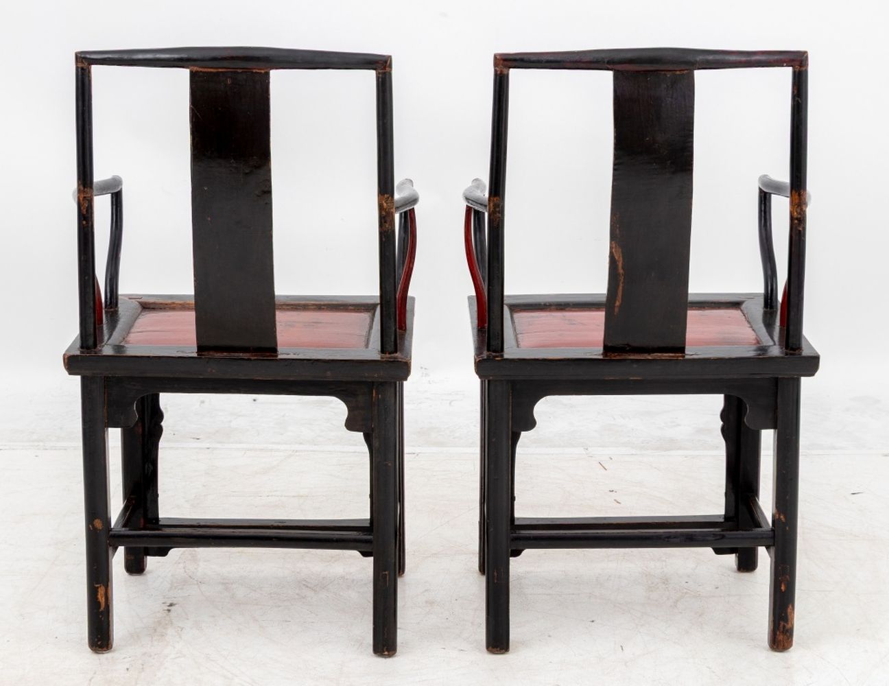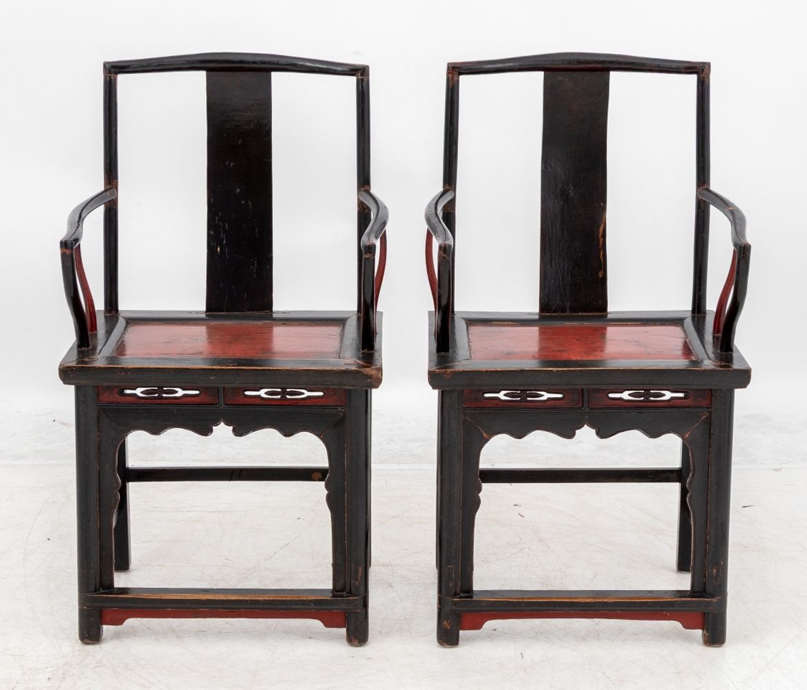Pair of Chinese Black Lacquered Armchairs, circa 1900, with red painted seat and carved apron conjoined by box stretcher. 41" H x 22.25" W x 17.25" D; seat: 17" H.  Provenance: From a West 12th Street Estate. Keywords: Antique Furniture, Seating, Elbow chair, Carving, Asian furniture, Interior design, Decorative Arts