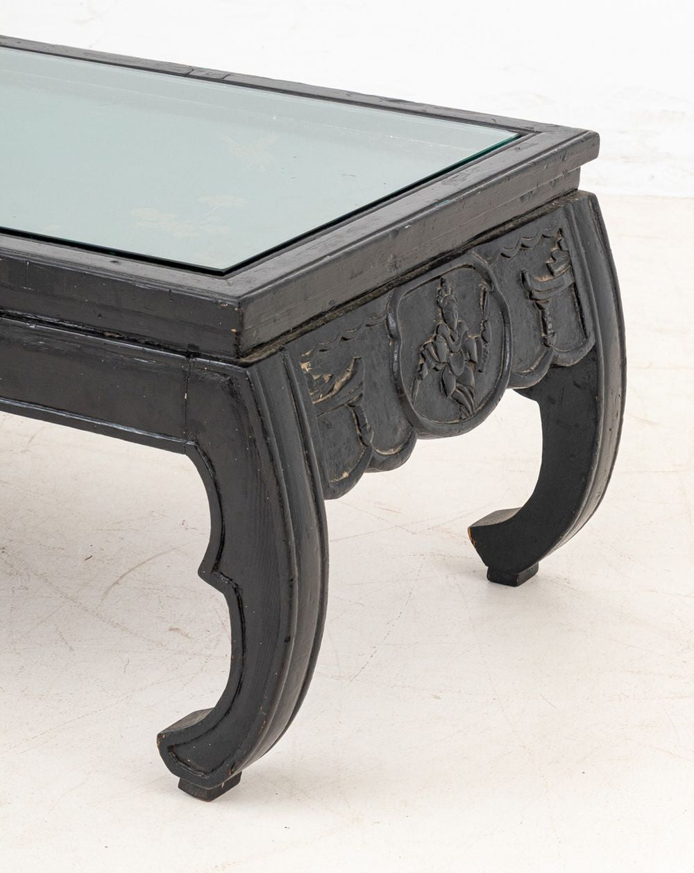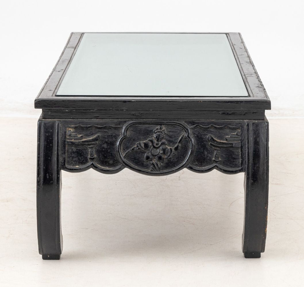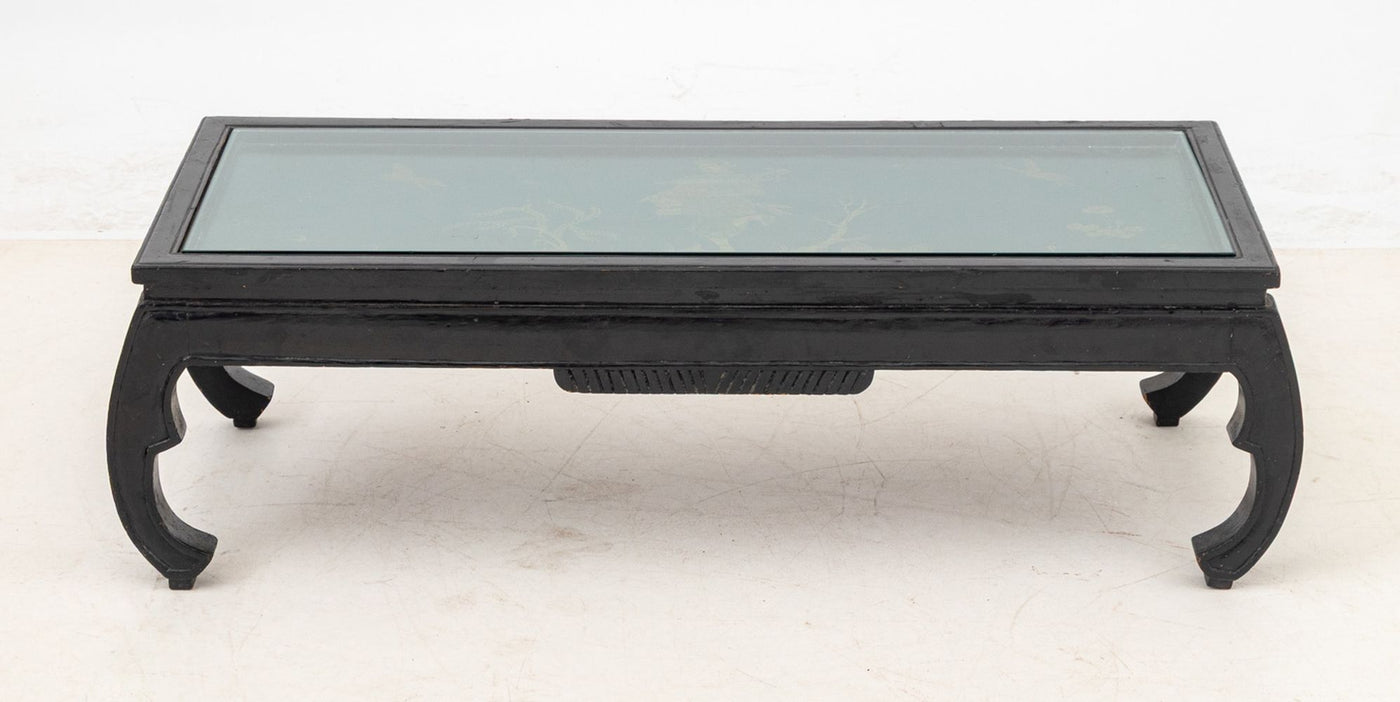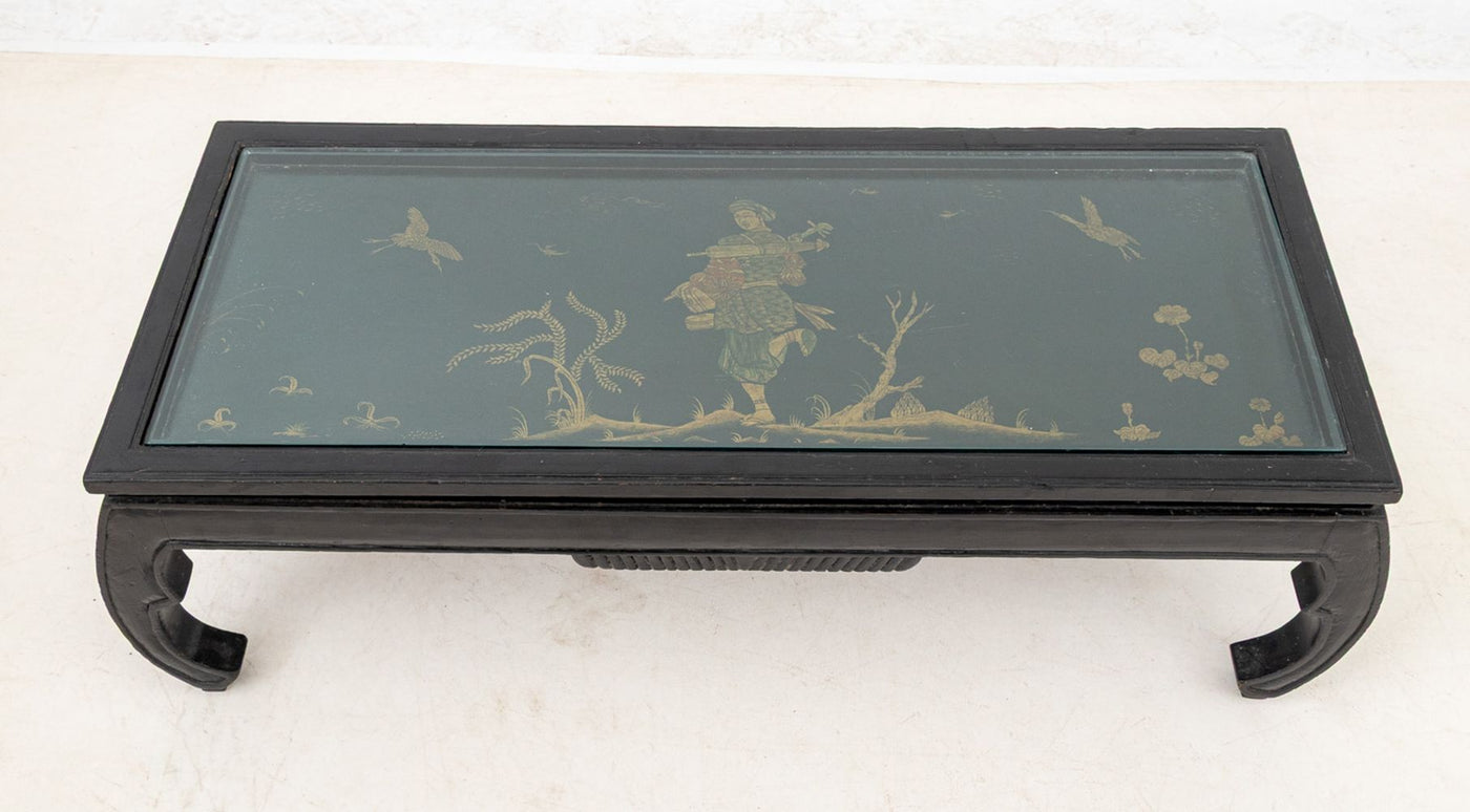 Chinese Ebonized and Paint-Decorated Low Table, 20th century, the rectangular top with inset glass panel, painted with a traveler in a landscape, on inward scrolled legs. 13" H x 43" W x 18" D. Keywords: Asian Furniture, Coffee Table, Accent Table, Side Table, Kang, Chinoiserie, China, Carving, Painting, Interior design, Decorative Arts