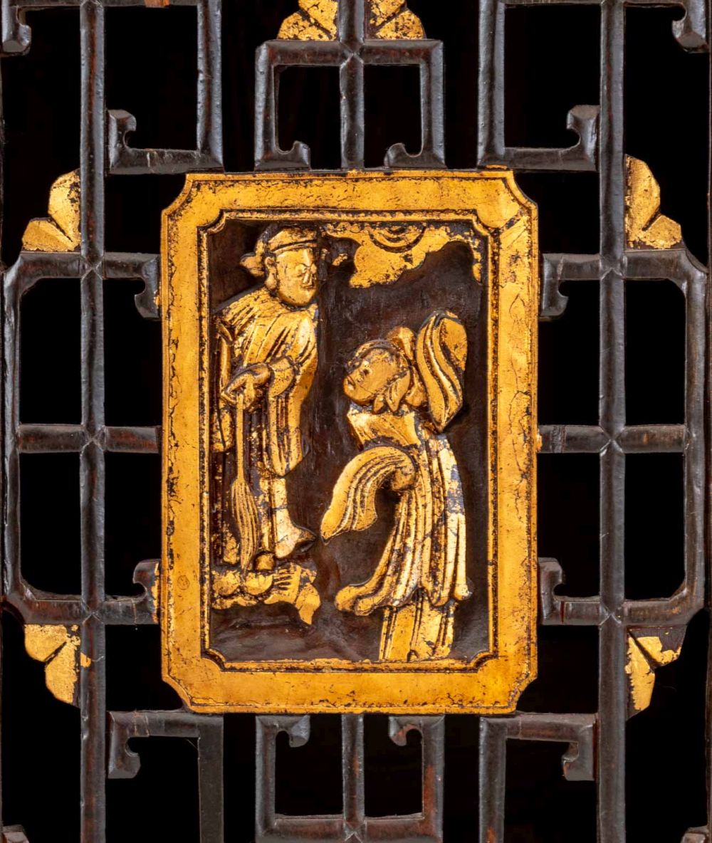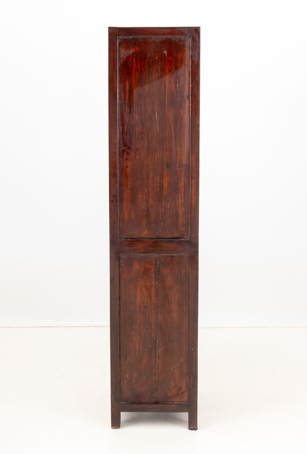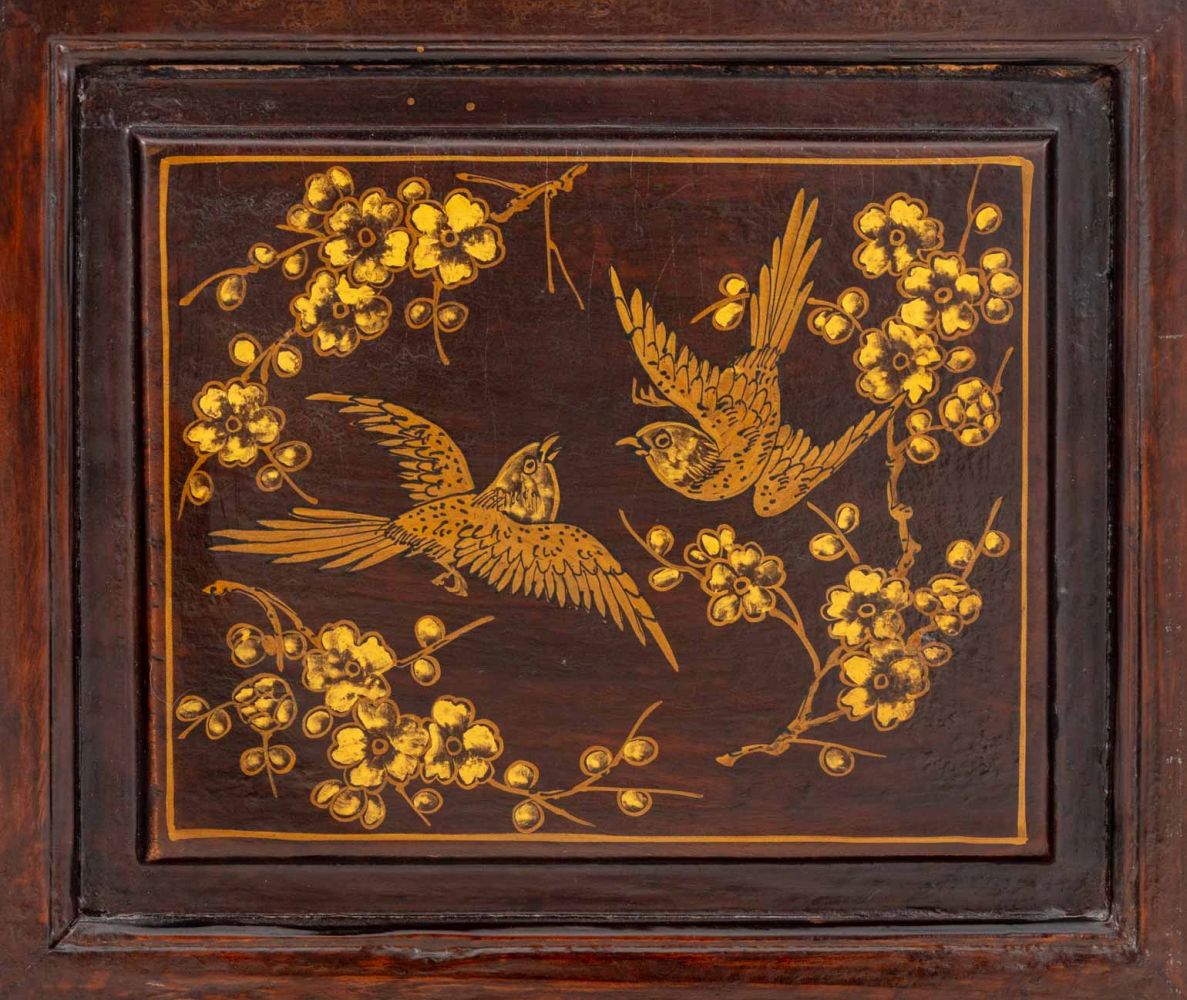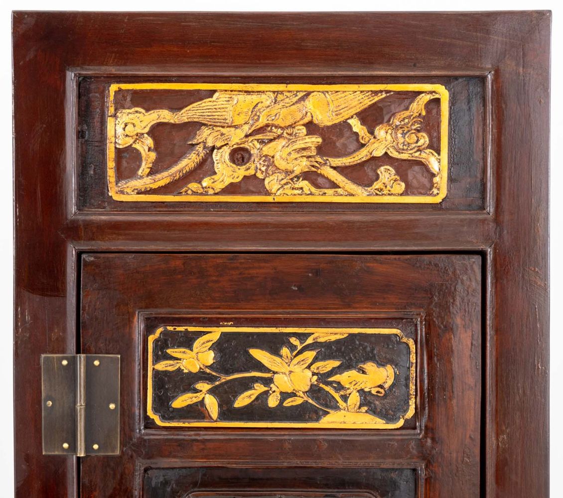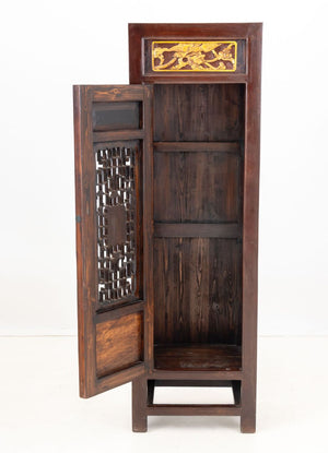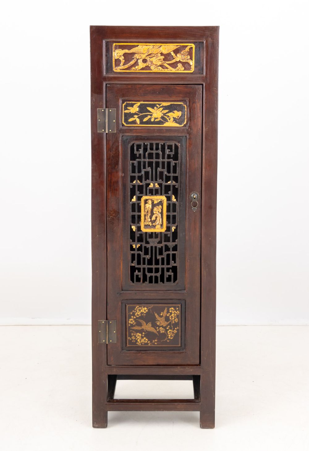 Chinese Hongmu Cabinet, the pierced single door carved with bird motif and gilt accents. 67.75" H x 21" W x 15" D. Provenance: From a Brooklyn Collection. Keywords: Chinese Furniture, Asian Furniture, Storage, Armoire, Wardrobe, Interior design, Decorative Arts