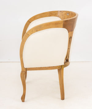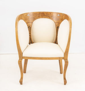 French Art Deco Mother-of-Pearl Inlaid Floral Marquetry and Walnut Upholstered Tub Chair. 32.75" H x 27.5" W x 23" D; seat: 17" H.