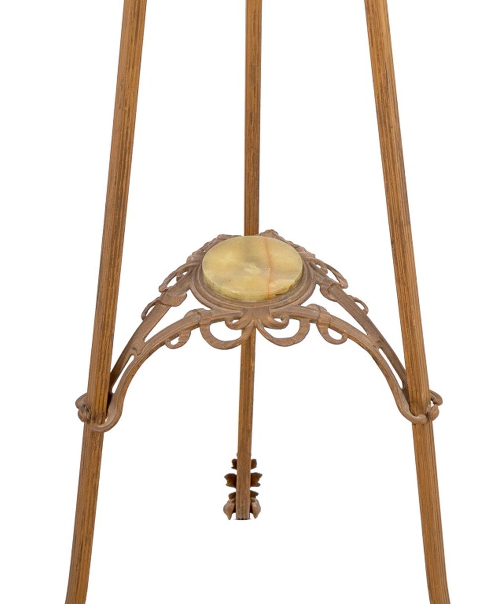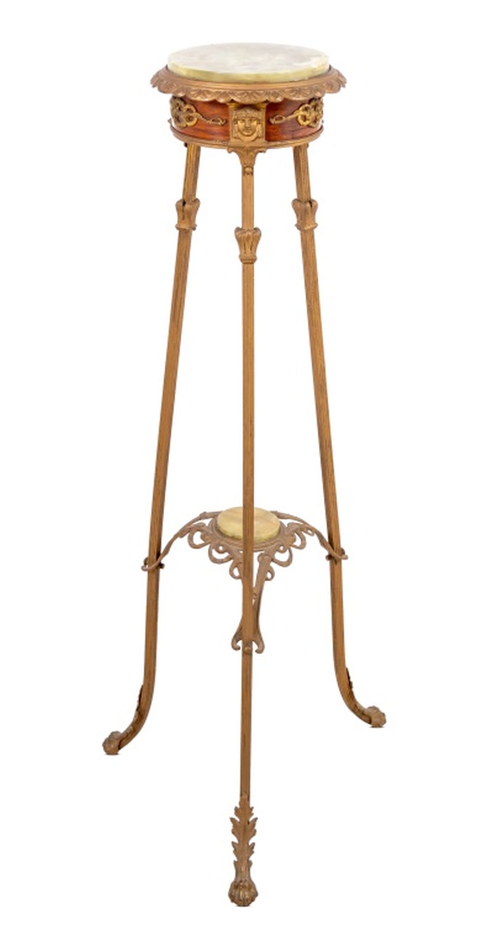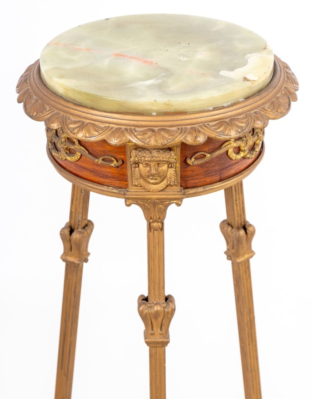 French Empire Gilt Metal, Mahogany, and Onyx Tripod Pedestal, early 20th century. 44" H x 20" W x 20" D. Keywords: European Furniture, Antique Furniture, Display stand, Plant stand, Sculpture gallery, Column, Plinth, Interior design, Gilded Age, Decorative Arts