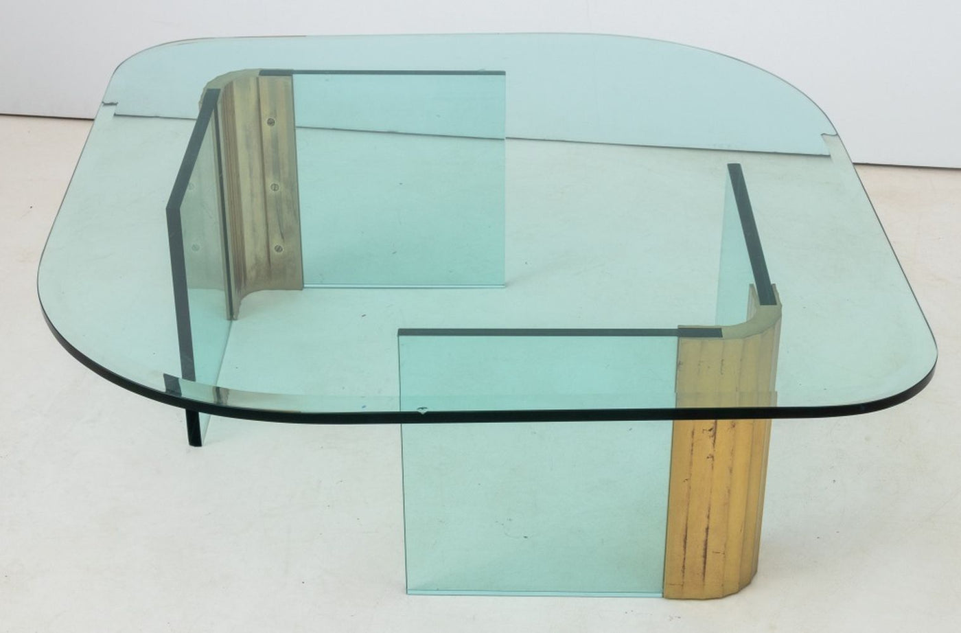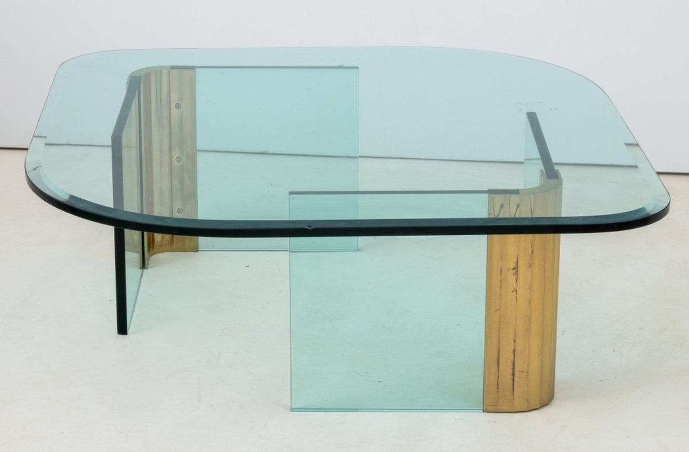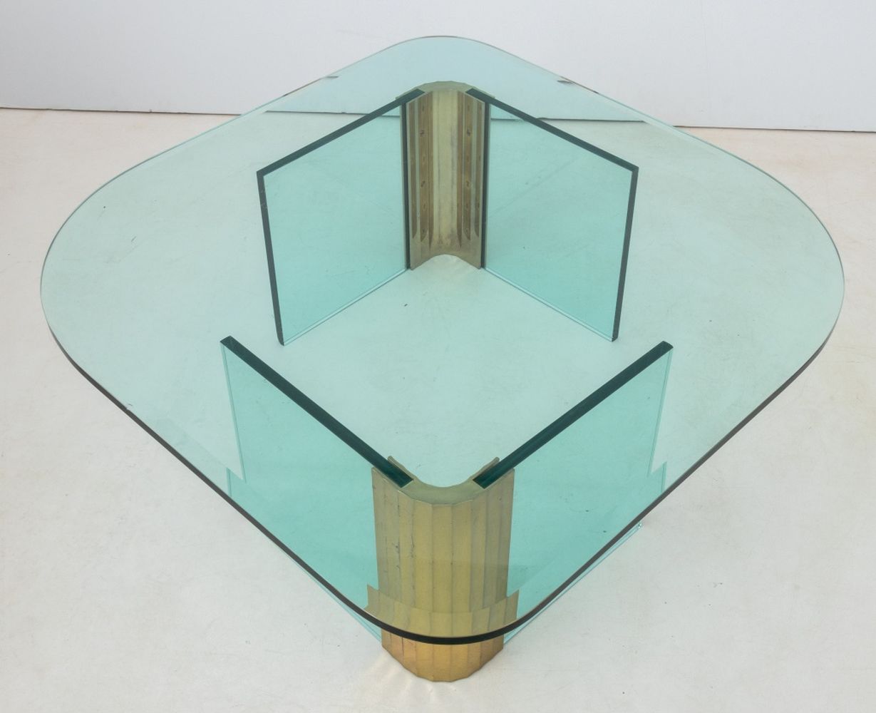 Leon Rosen Pace Collection Glass and Brass Coffee Table, 1970s, with V form bases. 16" H x 54" W x 47" D. Provenance: From a New York City Collection. Keywords: Modern Furniture, Designer, Center table, Accent table, Sofa table, MCM, Mid-Century Modern, Minimalism, Interior design, Decorative Arts