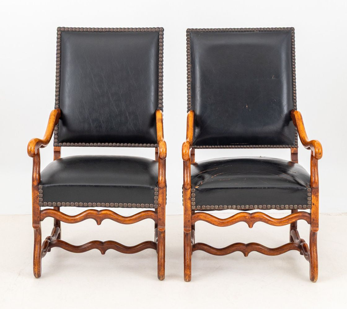 Pair of Louis XIV Style Walnut Fauteuil, with riveted black leather upholstery on four carved wood legs conjoined by H-form stretcher. 44" H x 24" W x 25" D; seat: 18.25" H. Provenance: From an Upper West Side, New York City Estate. Keywords: Vintage Furniture, Seating, Armchair, Easy chair, French style, Upholstered, Interior design, Decorative Arts