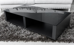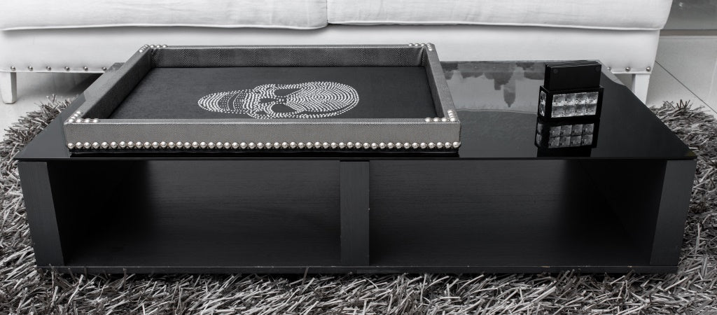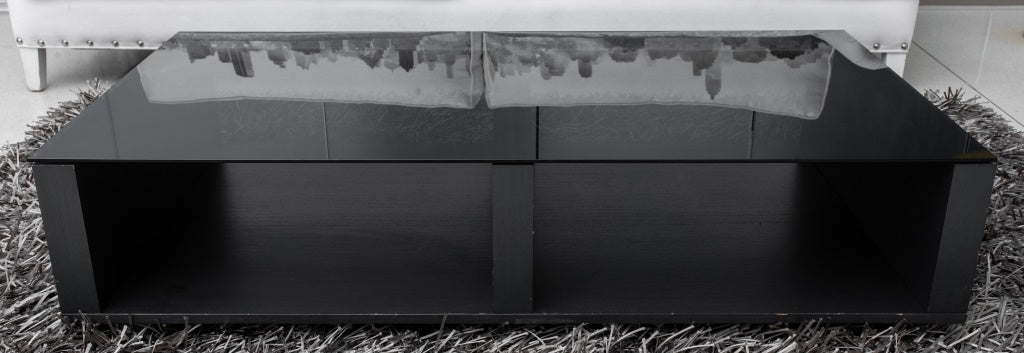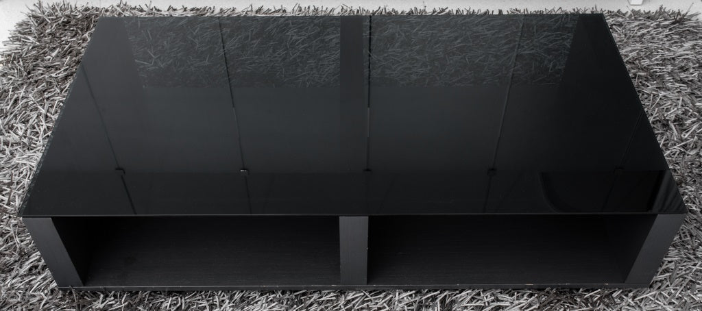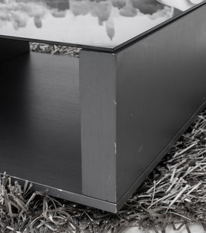 Modern Minimalist black coffee table, with a smoky glass top on an open black engineered wooden base, accessories not included. Light abrasions to one bottom corner.