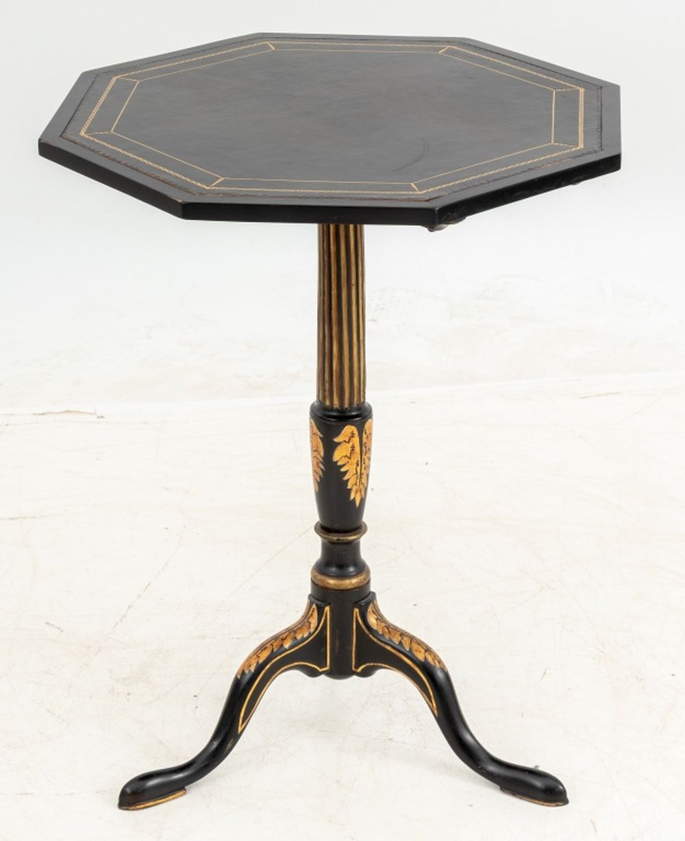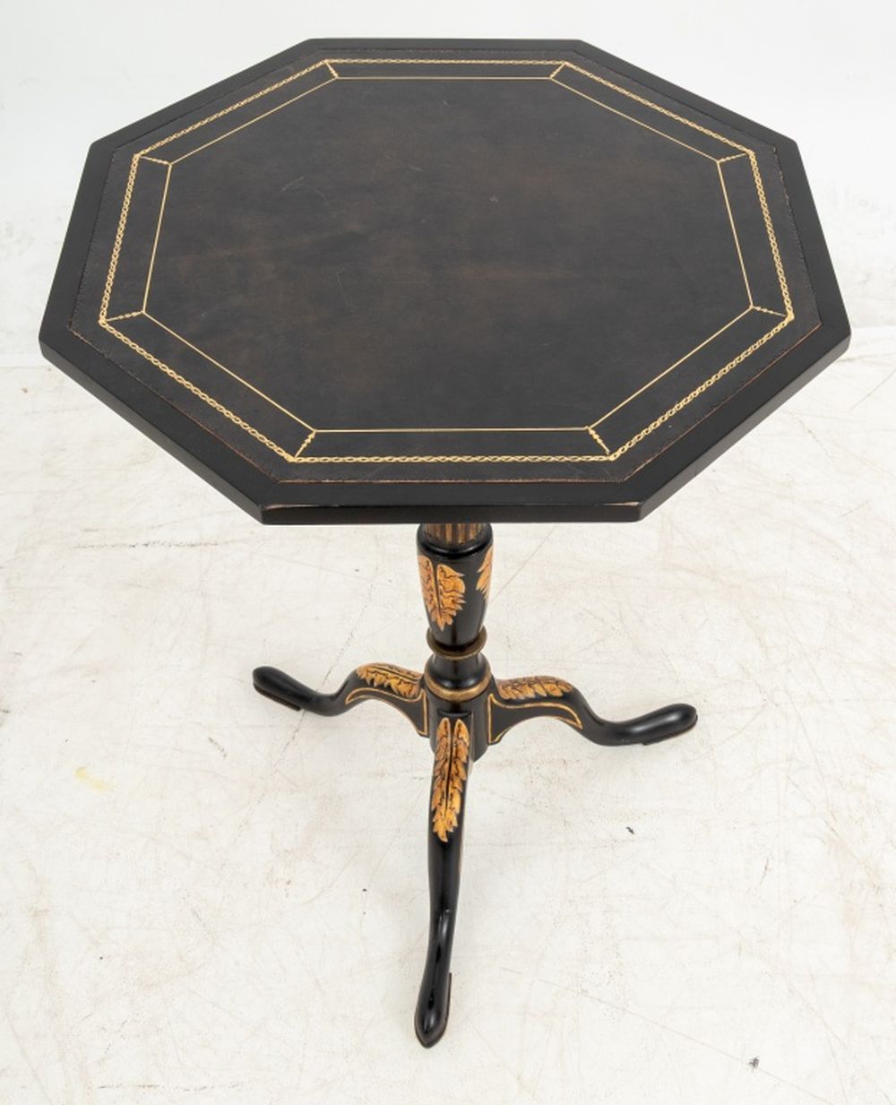 Regency Style Ebonized and Gilt Painted Wood Tripod Table, 19th century, the octagonal top with gilt tooled leather surface above a fluted stem. Top tilted: 40" H x 22" W x 20" D. Provenance: From a Palm Beach Collection. Keywords: Antique Furniture, English Furniture, British Furniture, Tilt top table, Tea table, Side table, Accent table, End table, Carved wood, Column, Interior design, Decorative Arts