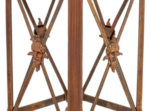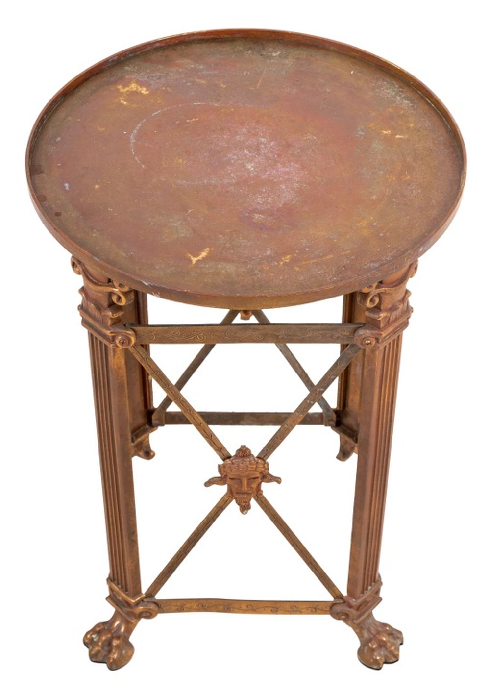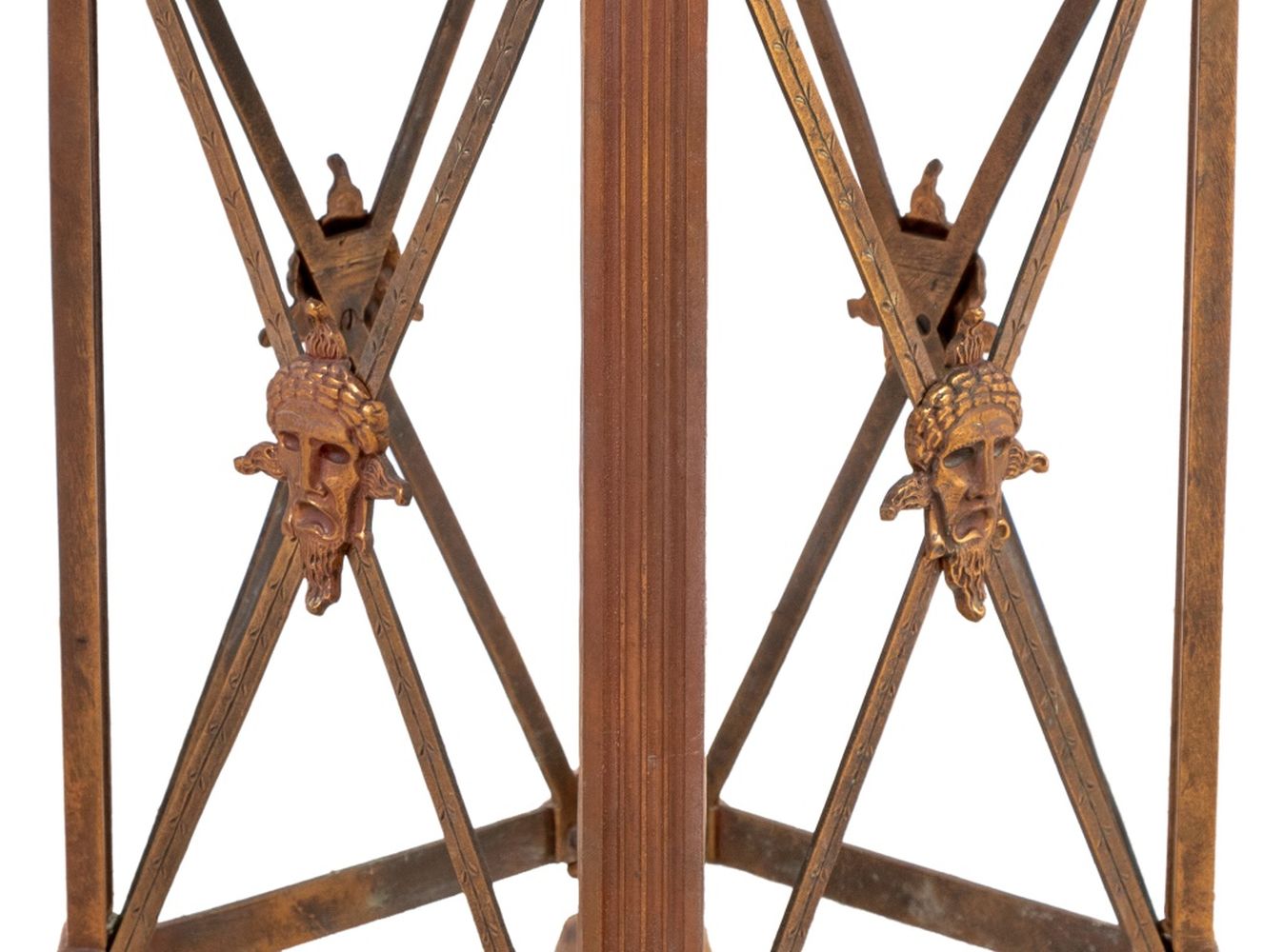 Roman Style Brass Circular Lamp Table, After the Antique, 20th century, the circular dish top above cantered reeded legs, joined by cross supports, centered by masks, on paw feet. 22" H x 15.5" Diameter. Keywords: Neoclassical Furniture, Occasional Table, Side Table, Pedestal Table, Light stand, Display stand, Sculpture gallery, Plant stand, Masque, Interior Design, Decorative Arts