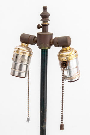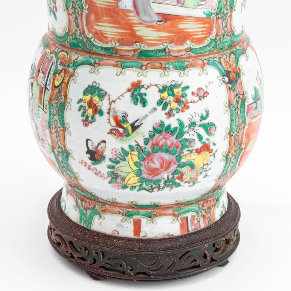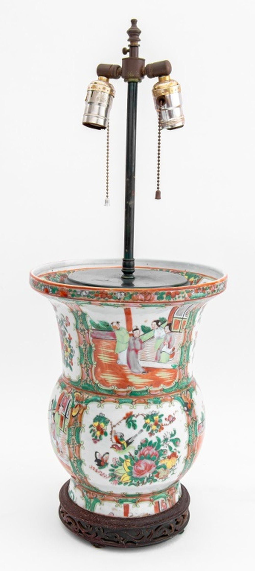 Chinese Famille Rose Porcelain Vase Mounted as a Lamp, with two light fixtures, decorated with alternating scenes of birds and flowers and figural scenes in palace courtyards, on carved wood base. 26" H x 10 " Diameter. Provenance: From a 50 Central Park West Estate. Keywords: Lighting, Asian Arts, China, Ceramics, Vessel, Painted, Polychrome, Figurative, Nobles, Court, Gardens, Butterflies, Interior design, Decorative Arts