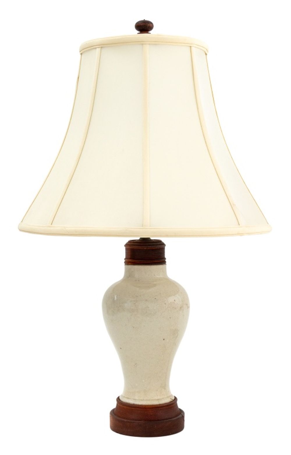 Chinese Glazed Stoneware Vase Mounted as a Table Lamp, 20th century, mounted on wood base and with white fabric shade. Overall: 23" H x 14.5" Diameter. Provenance: From a 35 East 75th Street Estate. Keywords: Lighting, Ceramics, Glazing, Asian Arts, China, Vessel, Flower holder, Accent lamp, Decorative Arts