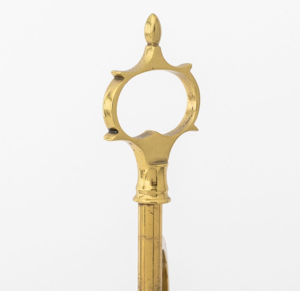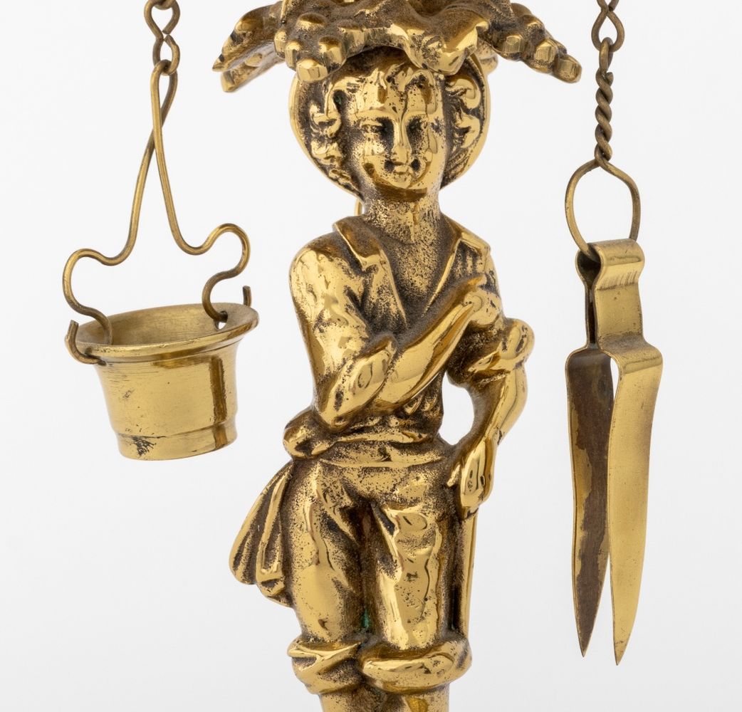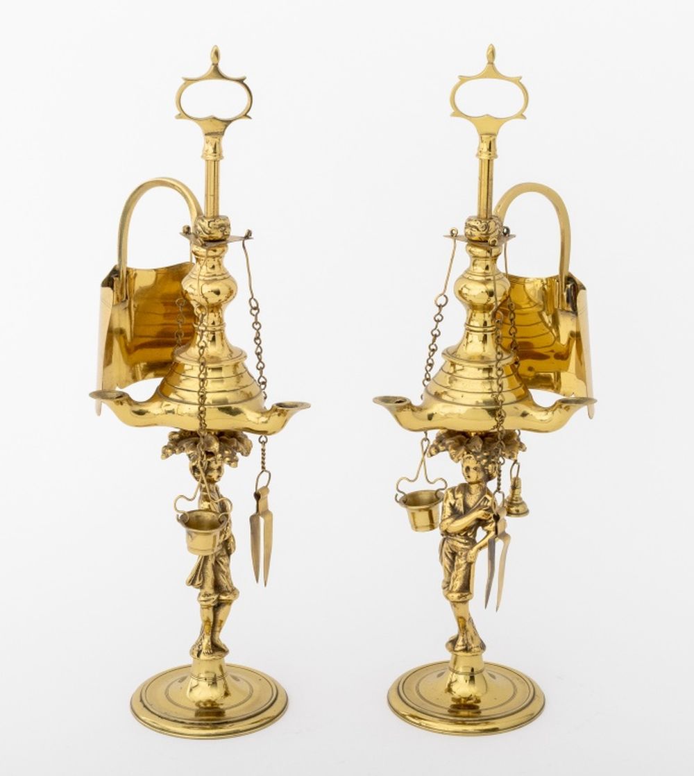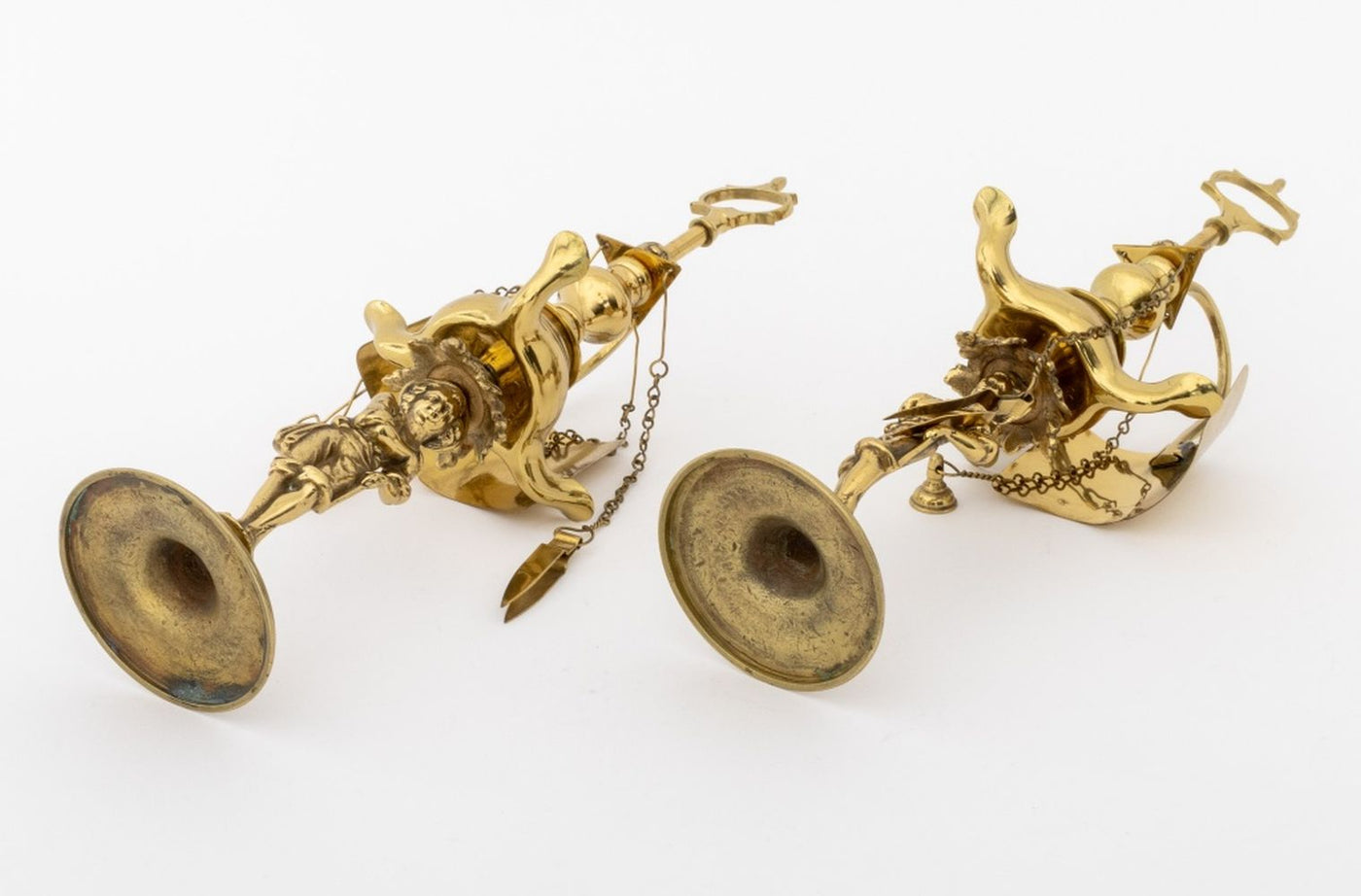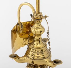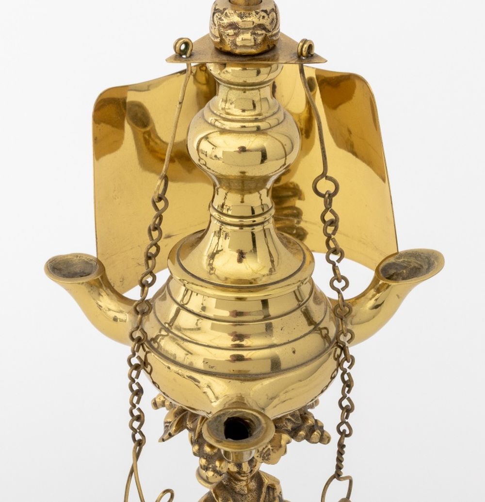 Pair of Italian Brass Lucerne Oil Lamps, 19th century, with three spouts above figural support with foliate motif on a circular base. 14.75" H x 4.5" Diameter. Provenance: From a Greenwich, Connecticut Collection. Keywords: Lighting, Torch, Portable light, Metalwork, Figurative, Interior design, Decorative Arts, Antique