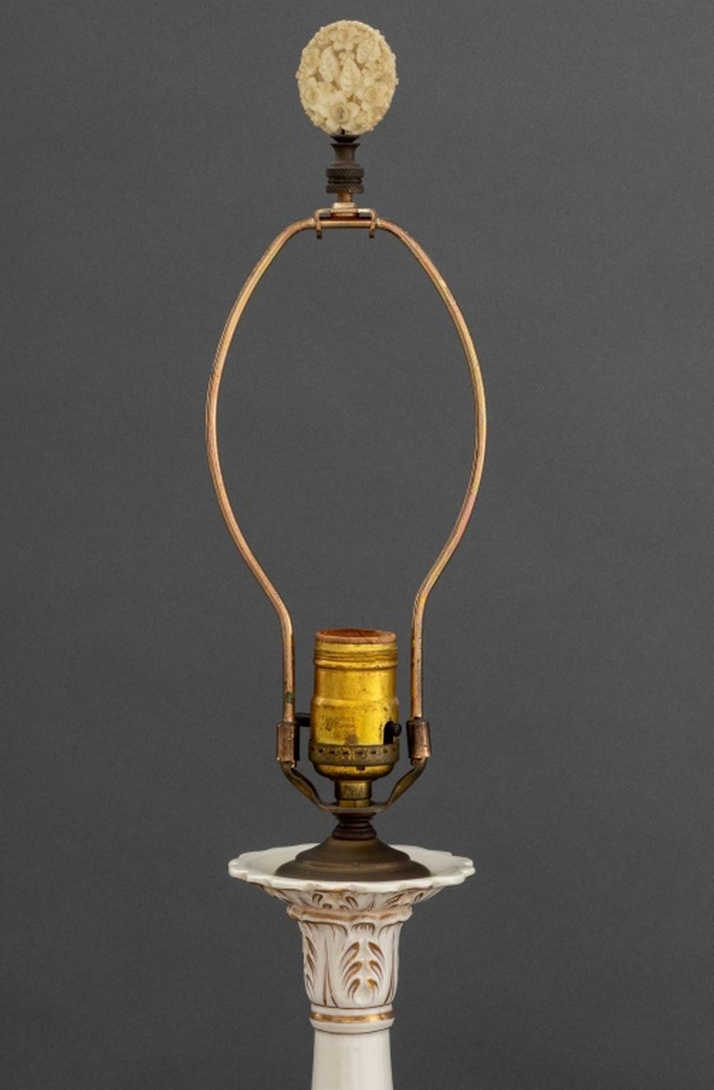 Pair of Italian Porcelain Columnar and Swan Motif Table Lamps, with gilt trim on triangular base, marked "Italy" to underside. 31.5" H x 8" W x 7" D. Provenance: From a New York City Collection. Keywords: Lighting, Table lamps, Ceramic, Acanthus leaf, Birds, Floral, Interior design, Decorative