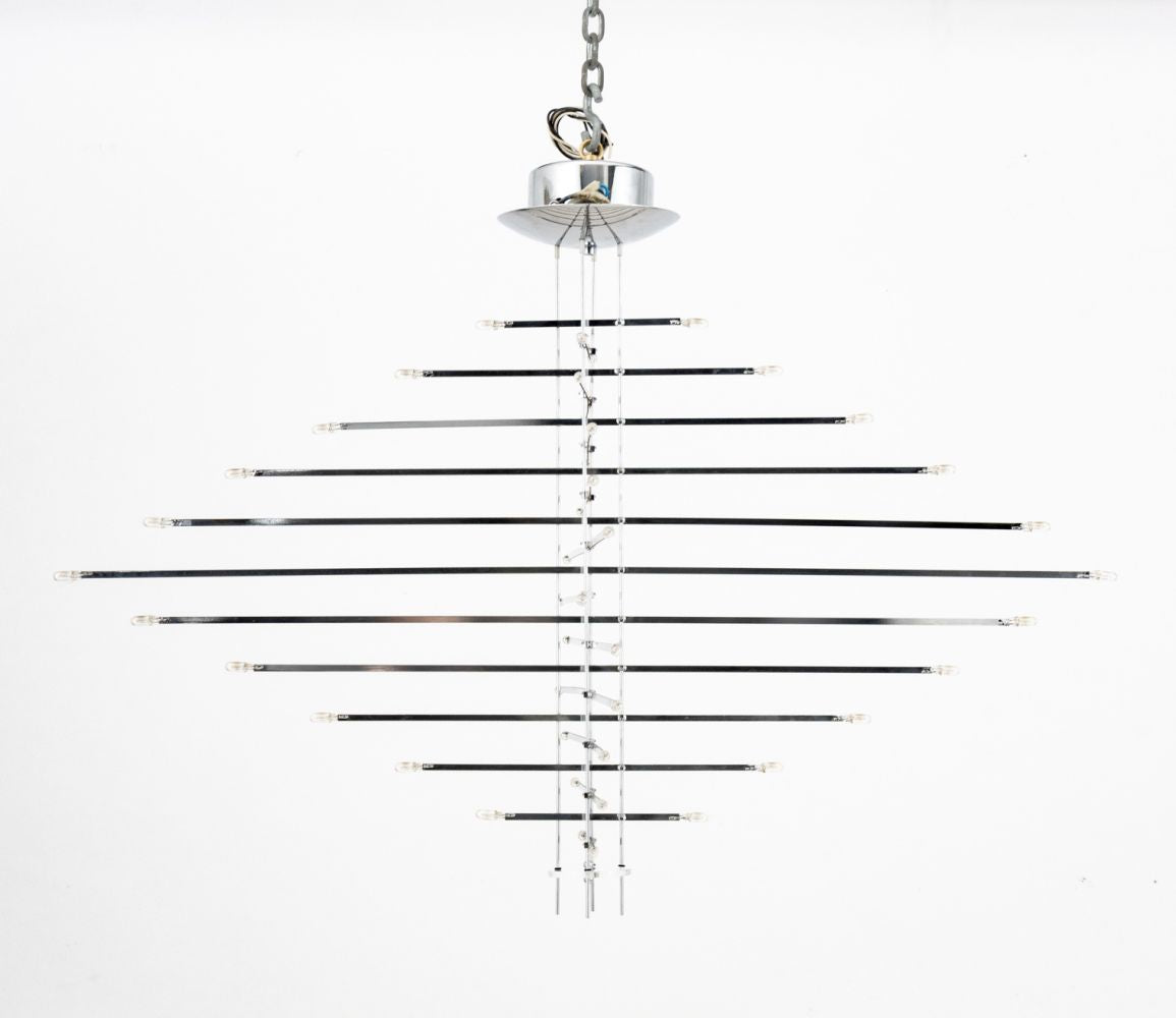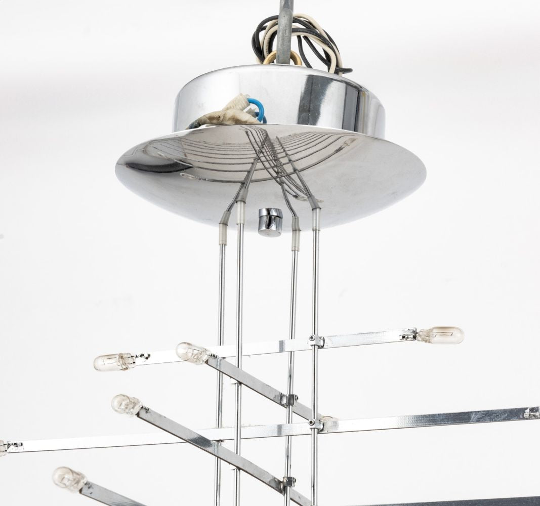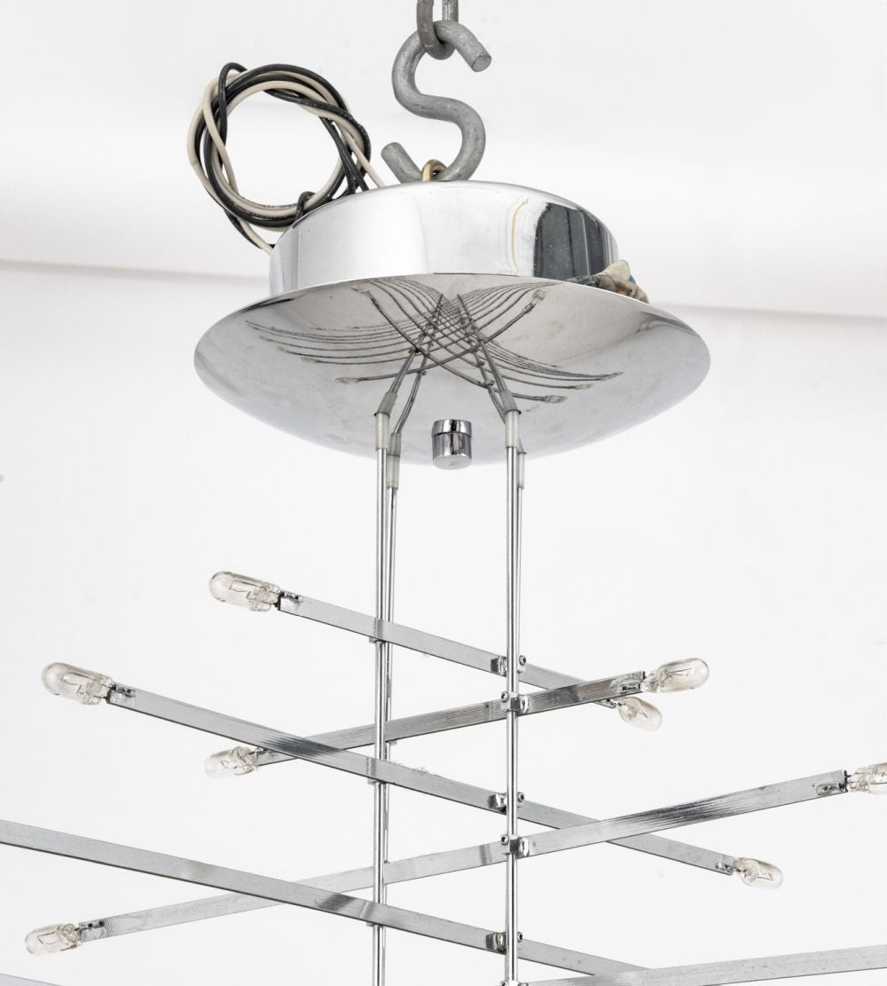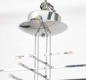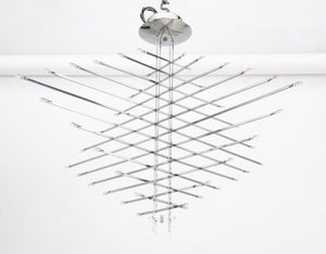 Modern Italian Chrome and Glass Suspension Light, having 22 graduated crossing arms with miniature light bulbs to each end. 27" H x 38" W x 38" D. Provenance: From a Long Island Estate. Keywords: Lighting, Hanging light, Chandelier, Interior design, Decorative Arts