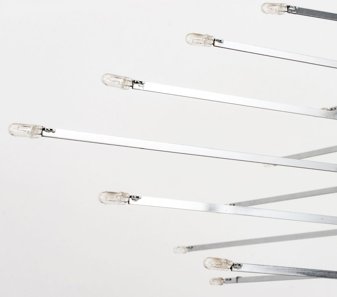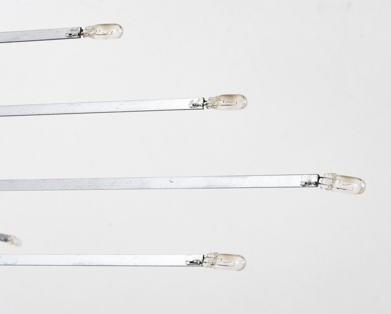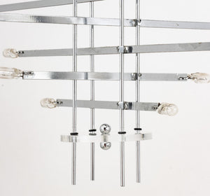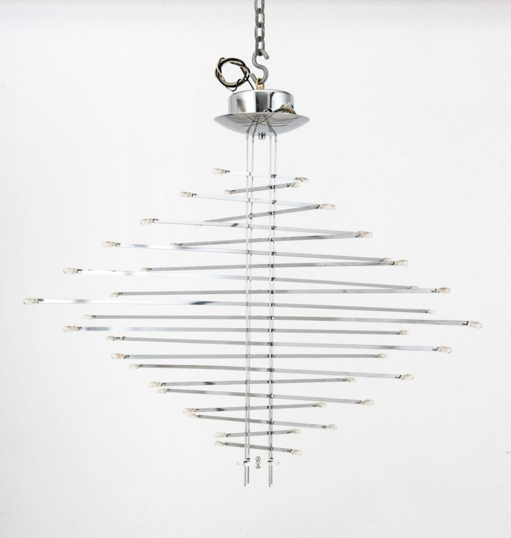 Modern Italian Chrome and Glass Suspension Light, having 22 graduated crossing arms with miniature light bulbs to each end. 27" H x 38" W x 38" D. Provenance: From a Long Island Estate. Keywords: Lighting, Hanging light, Chandelier, Interior design, Decorative Arts