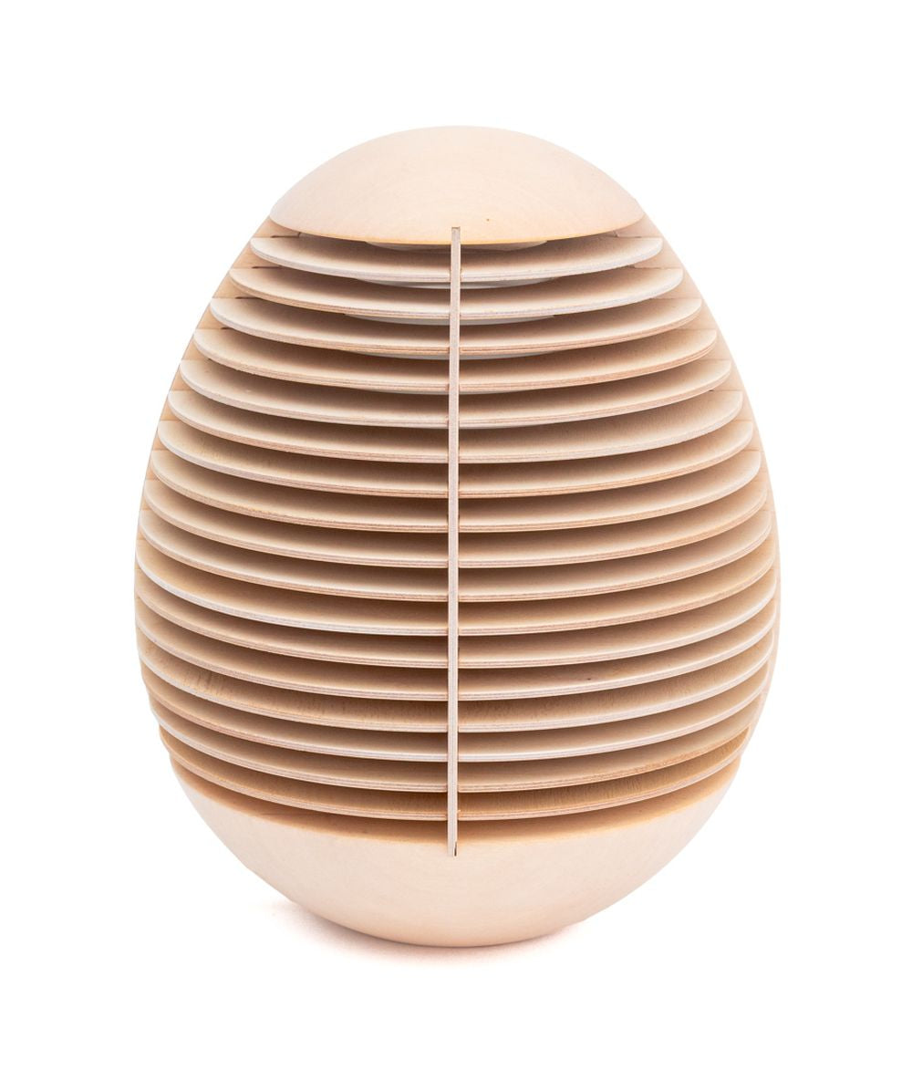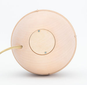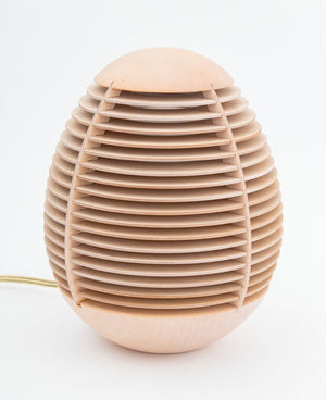 Penta "Tocco" Wood Table Lamp, egg shaped in oak wood and glass shade insert. 9" H x 7.5" Diameter. Provenance: From a Vintage Collection of Italian Designer Furniture Samples. Keywords: Lighting, Postmodern Design, Minimalist Modern, Space Age Style, Lighting, Ambiance Light, Italian Designer, Decorative Arts