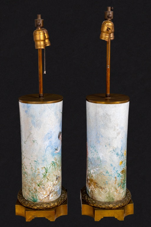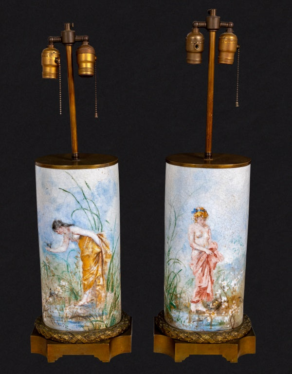 Pair of French Gilt Metal Mounted Cylindrical Porcelain Lamps, signed "Prevost", each hand-painted with a semi-clad woman standing among water reeds. 27" H x 8.5" W x 7.5" D.