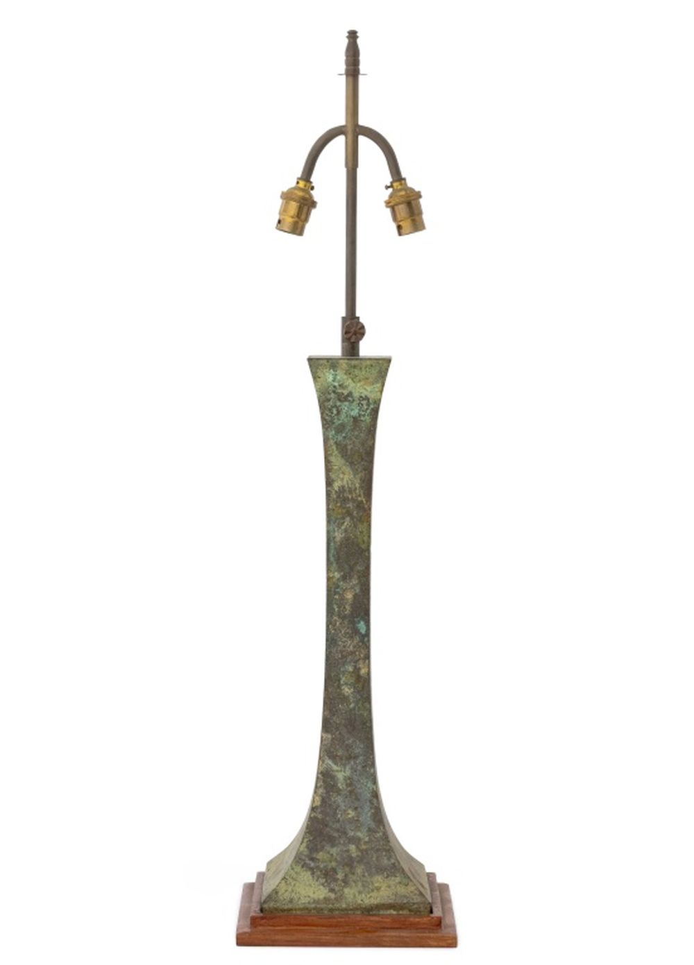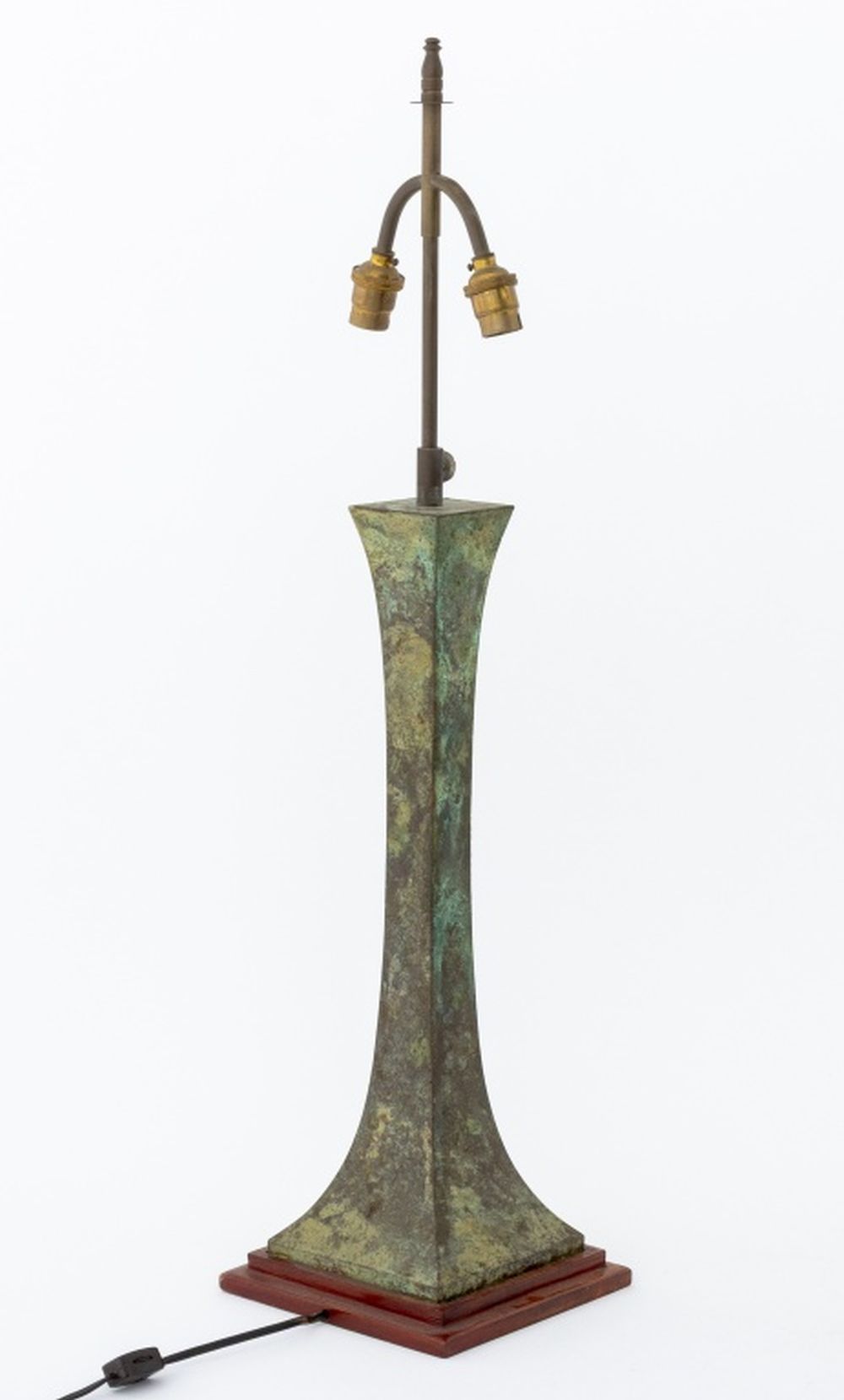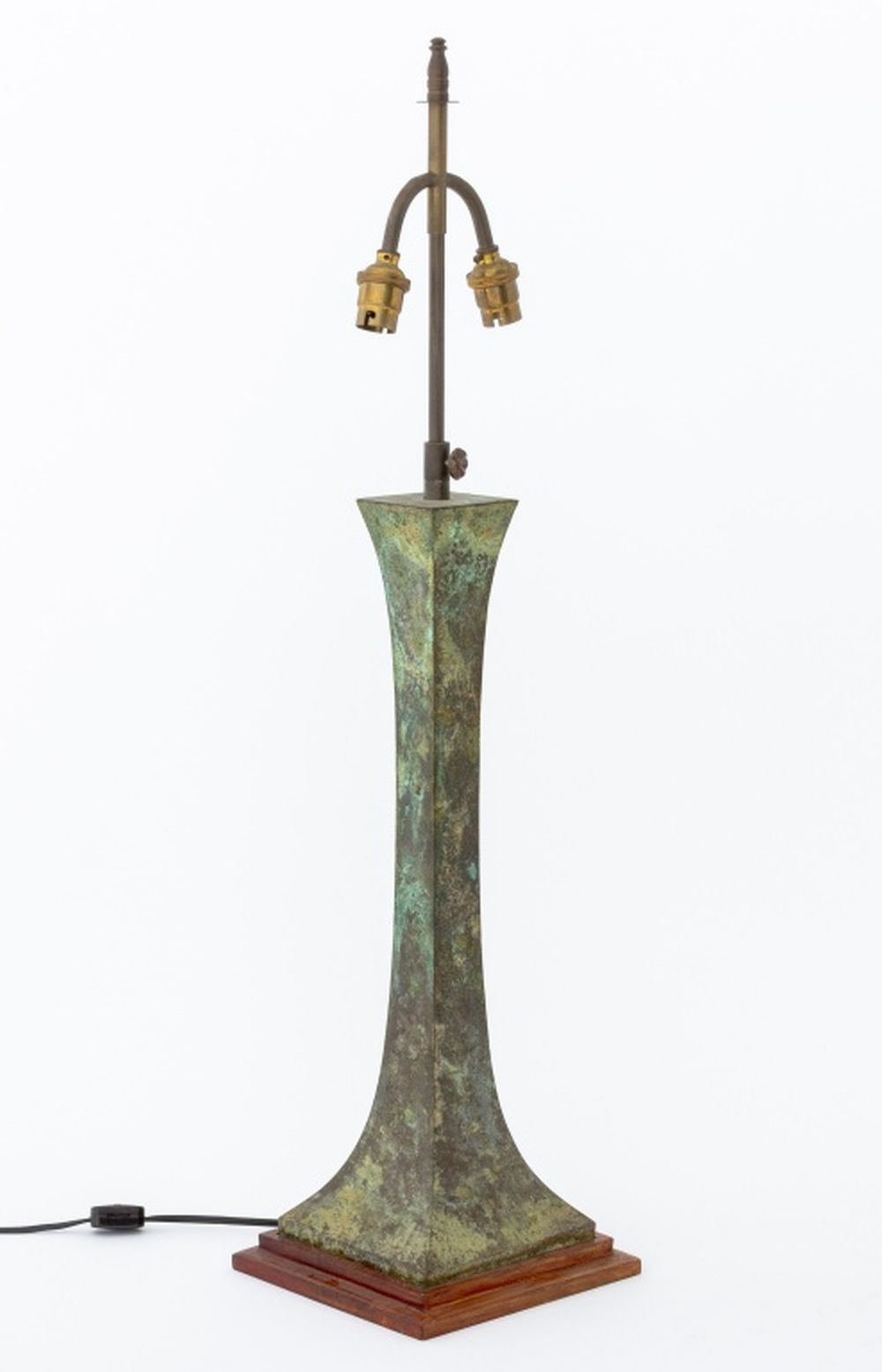 Stewart Ross James for Hansen Verdigris Patinated Bronze Table Lamp, circa 1960, atop tiered wood base with two light bulb fittings. 30.25" H x 7.25" W x 7" D. Provenance: From a Chelsea, New York City Collection. Keywords: Designer, Lighting, Accent lamps, Metalwork, Mid-Century Modern, MCM, Vintage, Sculptural, Home Accents, Interior design, Decorative Arts