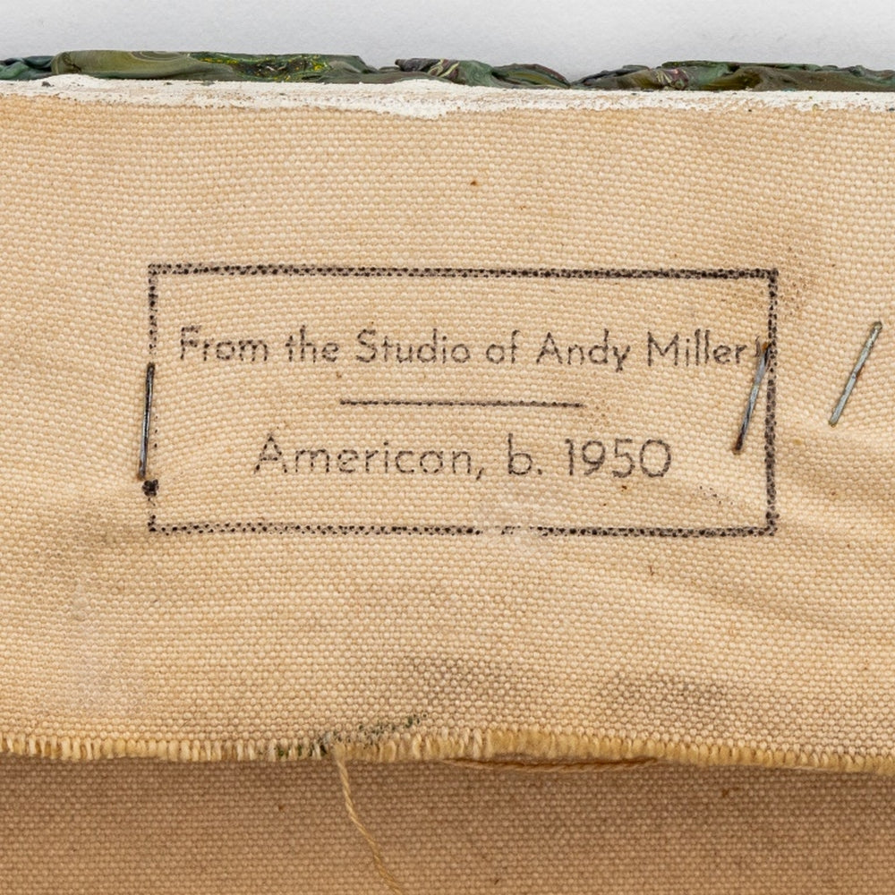 Andy Miller (American, b. 1950), Abstract Composition, Oil on Canvas, 1983, impasto details, warm green with ochre highlights, dated to verso, with artist's studio stamp to verso, apparently unsigned, unframed. 52" H x 62" W.