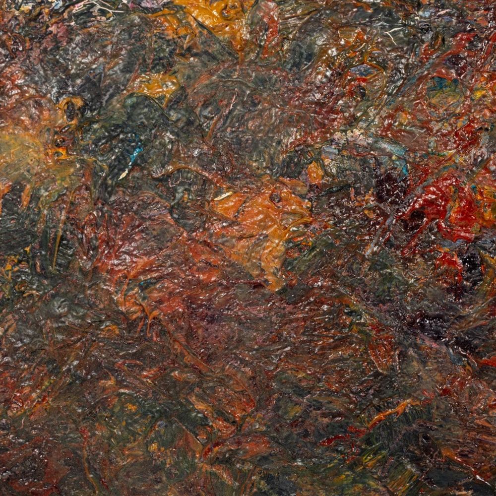 Andy Miller (American, b. 1950), Abstract Composition, Oil on Canvas, impasto details, warm green and cool red with ochre highlights, unsigned, artist's studio stamp to verso, unframed. 9.25" H x 14" W. Provenance: From the Studio of Andy Miller. Keywords: Painting, Works on Canvas, Abstraction, Abstract Expressionist, Abstract Expressionism, AbEx, Post-War and Contemporary Art, Polychrome, 20th Century School, Circle of Milton Resnick and Pat Passlof