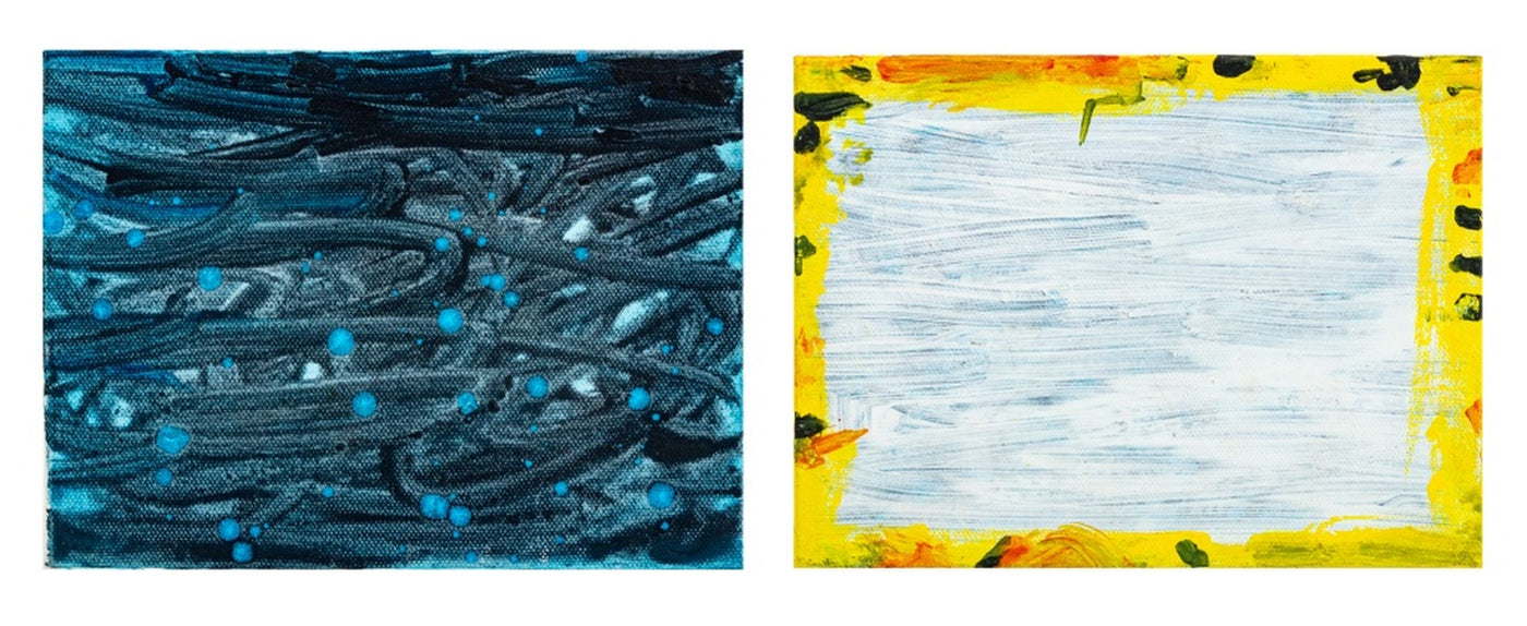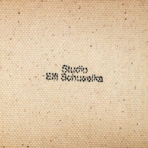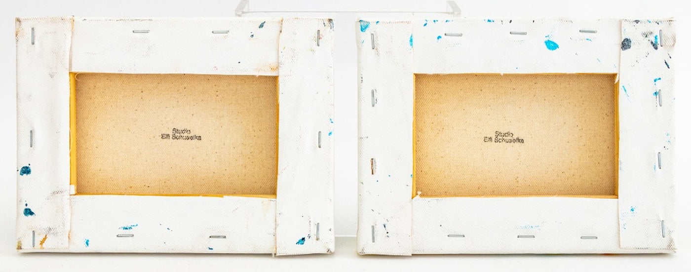 Elfi Schuselka (Austrian, b. 1940), Two Abstract Compositions, Mixed Media on Canvas, each stamped "Studio Elfi Schuselka" to verso, unframed. 6" H x 8" W x 0.75" D. Provenance: From the collection of the artist. Note: Schuselka studied photography, art history, and theater at the University of Vienna. She moved to New York in 1964. Her work has been exhibited internationally in the United States, Italy, France, and Japan, as well as at the Cracovia Biennial, Yugoslavia, Ibiza Biennial, Spain, and the Sao Paulo Biennial. Her work is part of the permanent collections of the Museum of Modern Art (MoMA), New York, the Amon Carter Museum of American Art, Fort Worth, and the International Centre of Graphic Arts, Slovenia. Long a regular exhibitor at the famed 55 Mercer Gallery, Schuselka is well-known in New York art circles together with her husband, Domenick Capobianco (American, b. 1928). Keywords: Painting, Works on Canvas, Abstraction, Second New York School, Polychrome, Geometric, Abstract Expressionist, Expressionism, AbEx, Women Artists, Contemporary Art