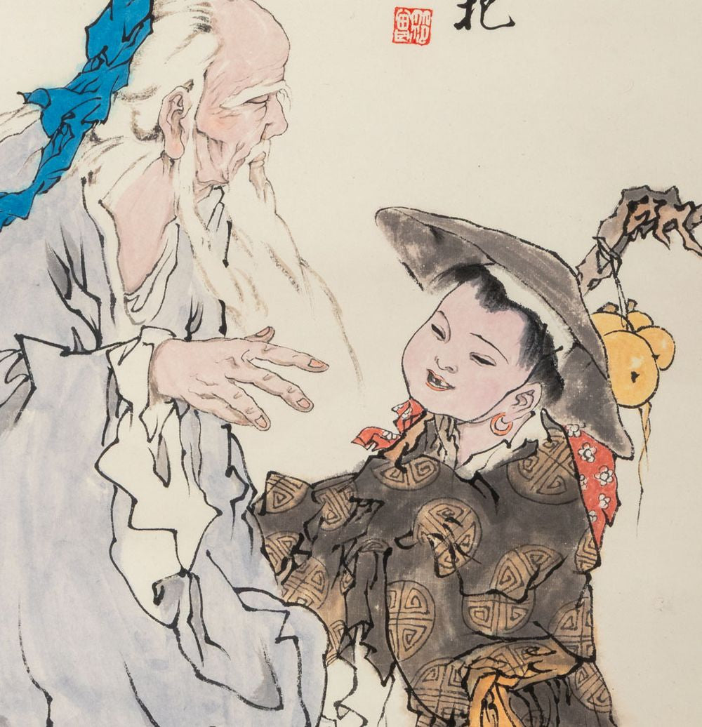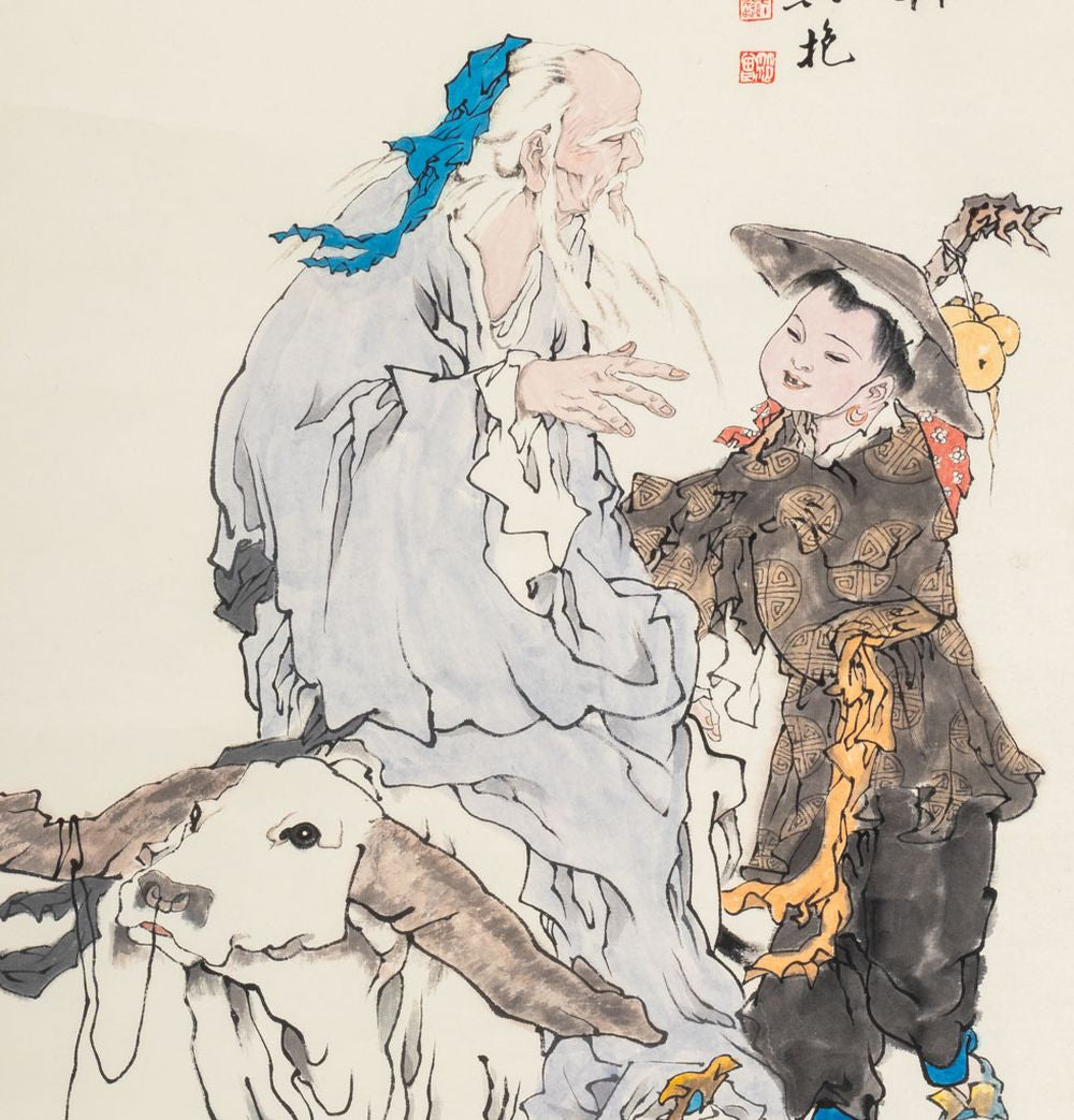 Fan Zeng (Chinese, b. 1938), "Lao Tzu's Exit Map", Ink on Paper, 1993, calligraphy and chop seal marks upper right and chop seal mark lower left. Image: 54.25" H x 27.25" W; whole: 83.25" H x 35" W. Provenance: From a New York City Collection. Keywords: Scroll Painting, Asian Artists, Laozi, Philosopher, Figural, Figurative, Figures, Oxen, 20th Century Art
