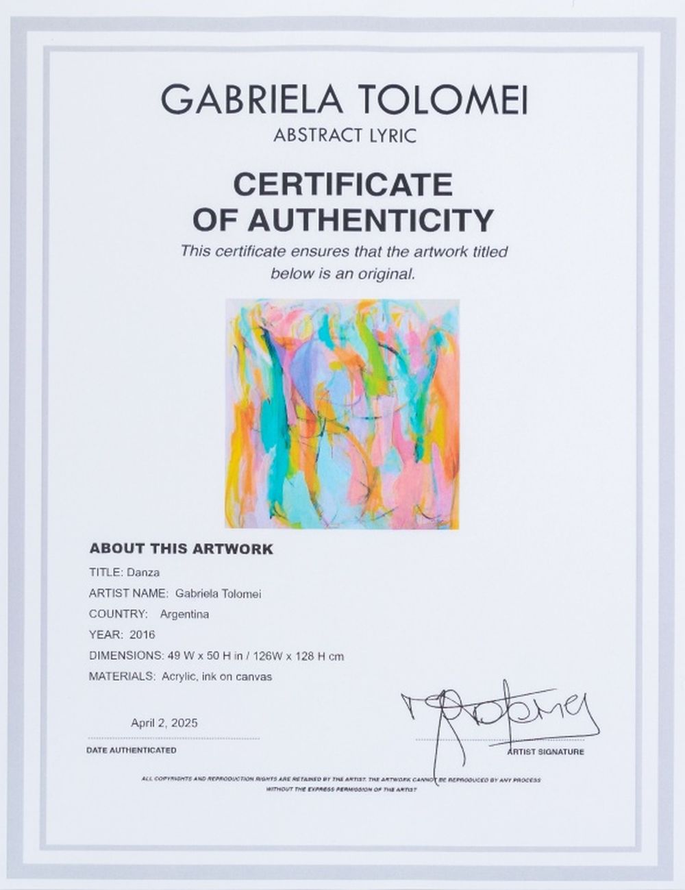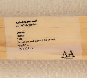 Gabriela Tolomei (Argentine, b. 1962), "Danza" [Dance],  Large Acrylic and Ink on Canvas, 2016, signed and dated lower right, signed, titled, and dated to verso, two Arlene Angard Gallery labels to verso, together with certificate of authenticity, unframed. 50" H x 50" W x 1" D. Provenance: From a New York City Collection. Keywords: Painting, Works on Canvas, Large painting, Polychrome, Colorful, Lyrical Abstraction, Women Artists, Contemporary Art