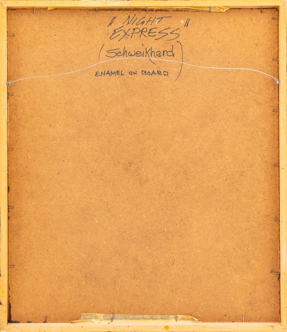 John Schweikhard (American, b. 1937), "Night Express", Gouache on Board, signed lower right, signed and titled to verso, blue painted wood frame. Image: 23.5" H x 20.25" W; frame: 25.25" H x 22" W. Provenance: From a Lexington Avenue Collection. Keywords: Painting, Oil painting, Works on canvas, Train, Locomotive, Industrial, NIght scene, 20th century Art