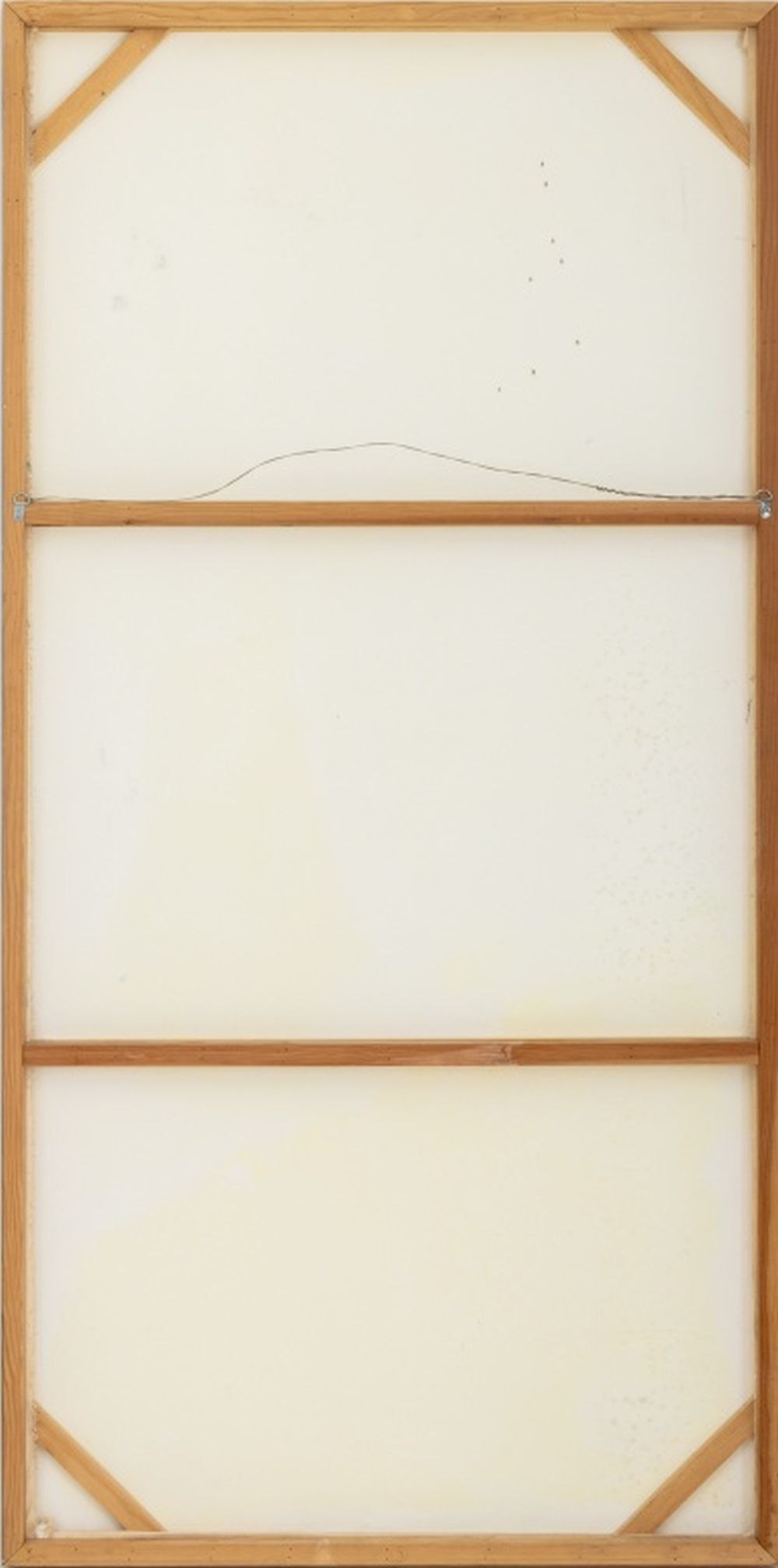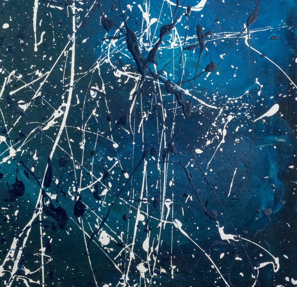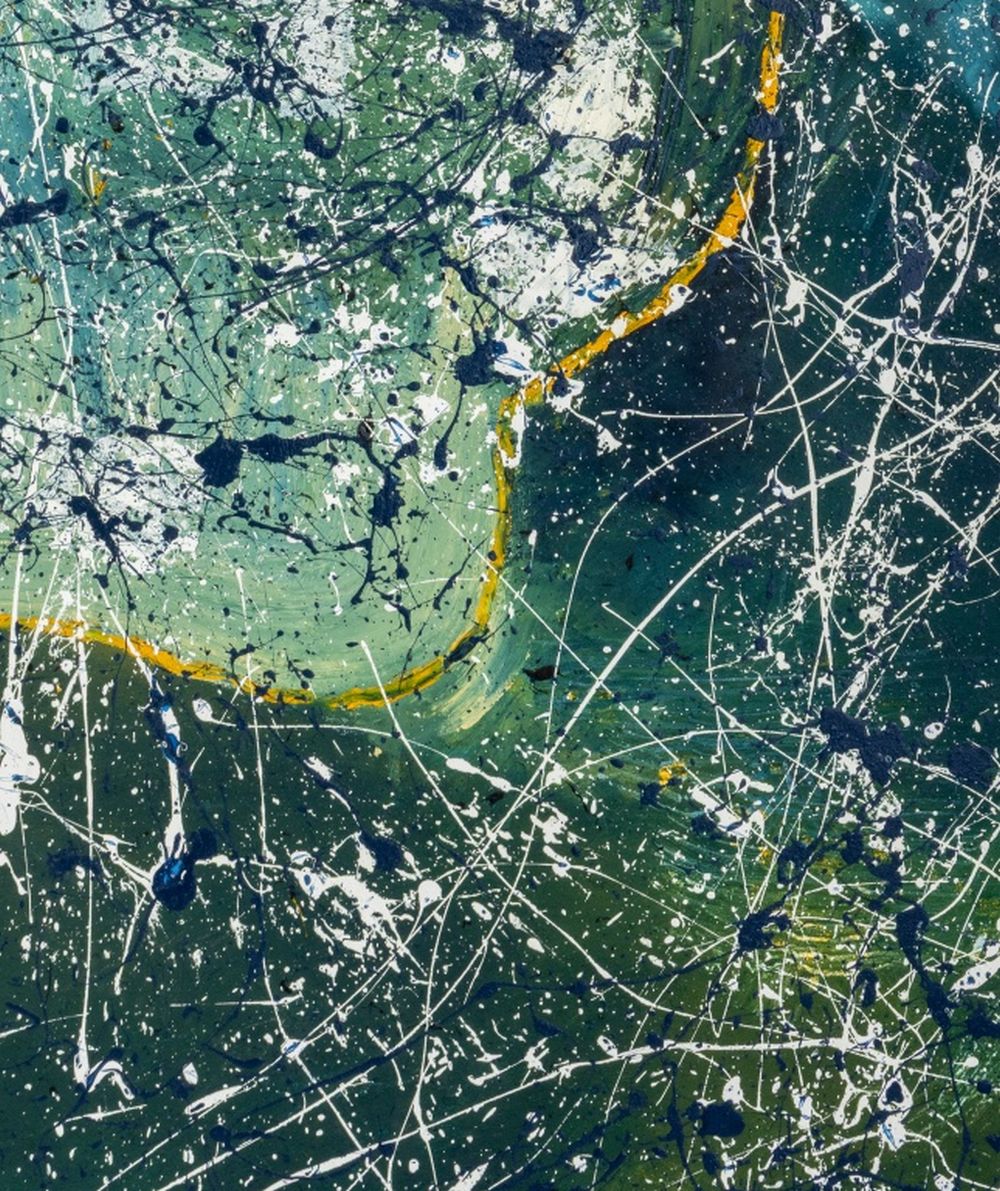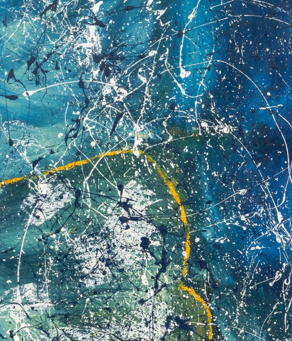 Large Abstract Splatter Composition in Blue and Green, Oil on Canvas, with yellow line with white and navy splatter, signed with impasto kanji mark lower left, unframed. 96.5" H x 48.25" W. Provenance: From a United Nations Plaza, Manhattan Estate. Keywords: Painting, Oil painting, Works on Canvas, Drip, Jackson Pollock Style, Abstraction, Abstract Expressionist, Abstract Expressionism, AbEx, Polychrome, 20th Century School, Post-War and Contemporary Art