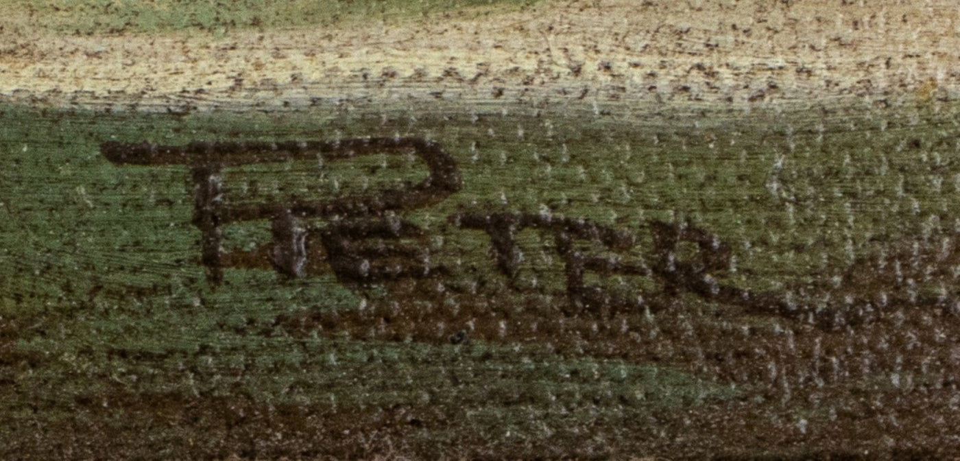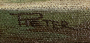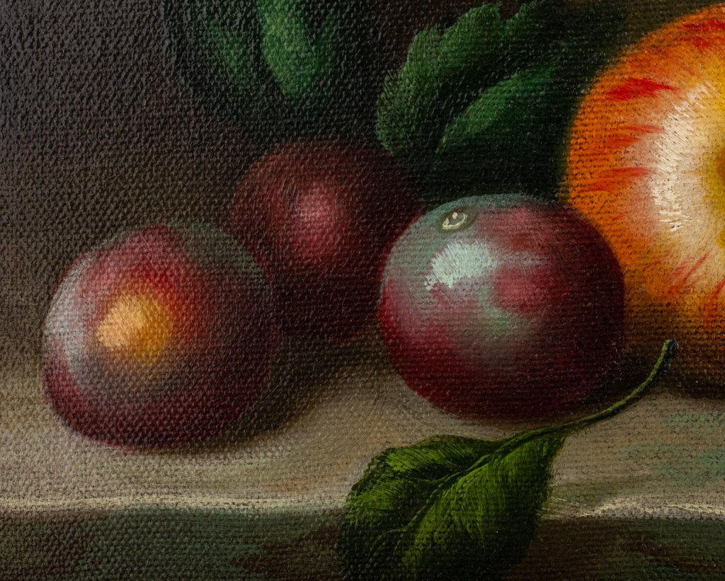 Oil painting on canvas depicting a still life scene with fruit atop a table, signed "Pieter" lower right, housed in a gilt wood frame.