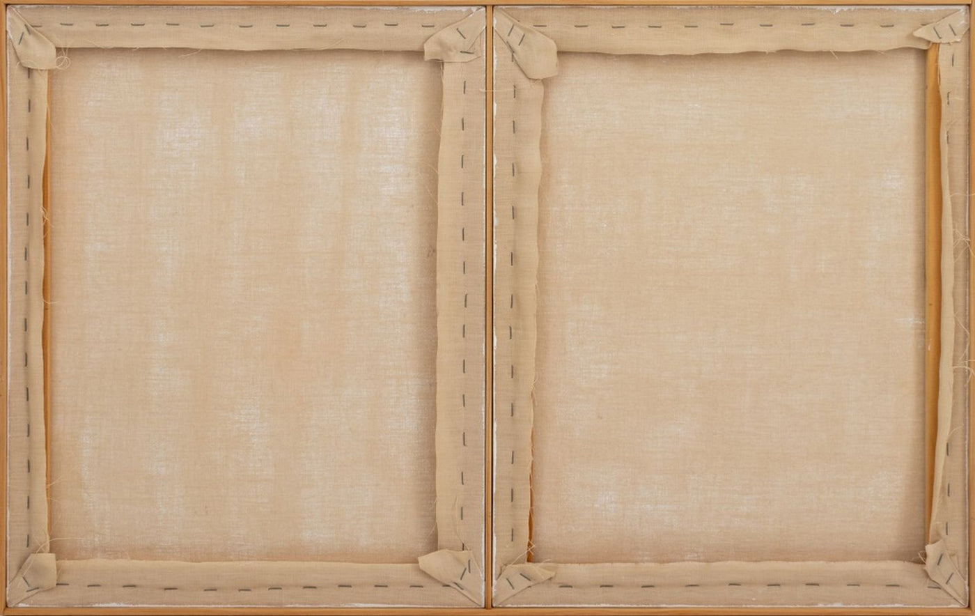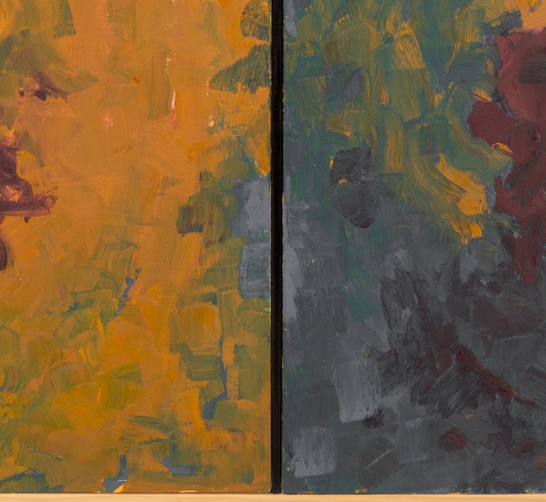 Robert O'Meara (American, 1957-2024), Abstract Composition Diptych in Ochre and Navy, Oil on Canvas, apparently unsigned, wood frame. Panels: 24" H x 19" W; frame: 24.5" H x 38.5" W. Provenance: From a 333 East 75th Street Estate. Keywords: Painting, Oil on Canvas, Abstraction, Abstract Expressionist, Abstract Expressionism, AbEx, Blue, Maroon, Polychrome, Contemporary Art