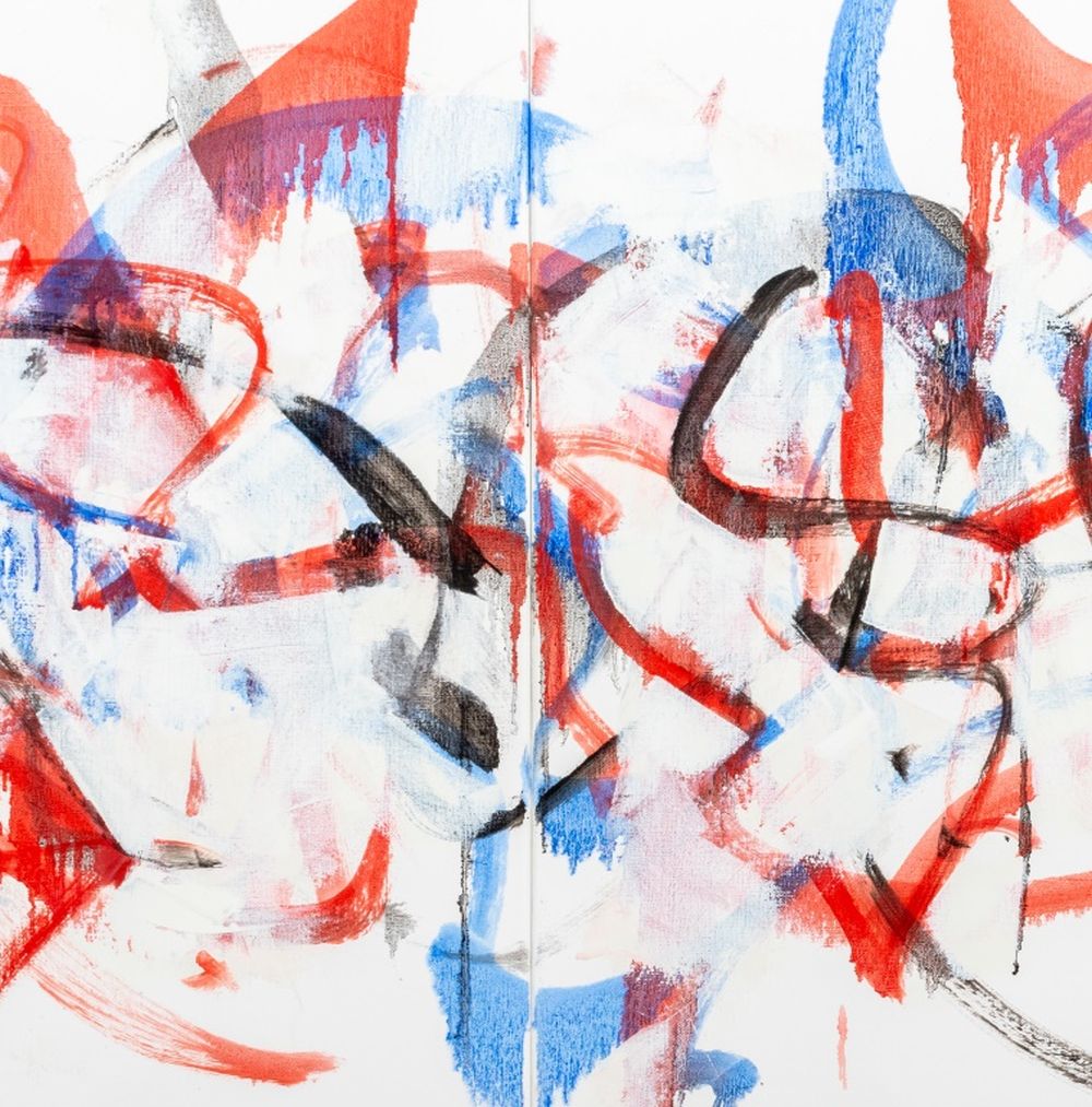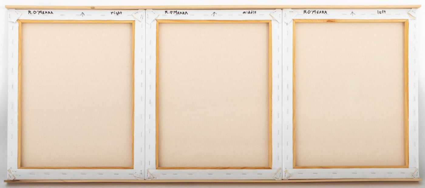 Robert O'Meara (American, 1957-2024), Abstract Composition Triptych in Blue, Red, and White, Oil on Canvas, signed "R. O'Meara" to verso, wood supports on top and bottom edges. Overall: 20.5" H x 48.25" W. Provenance: From a 333 East 75th Street Estate. Keywords: Painting, Oil painting, Works on Canvas, Abstraction, Abstract Expressionism, Abstract Expressionist, AbEx, Willem de Kooning style, Multi-colored, Polychrome, Contemporary Art
