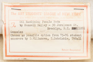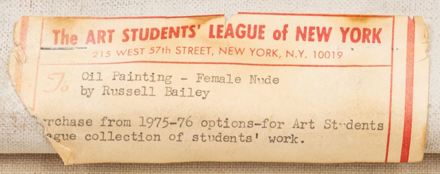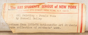 Russell Bailey (American, XX), Reclining Female Nude, Oil on Canvas, 1975-1976, apparently unsigned, "Art Students League of New York" label to verso, unframed. 40.25" H x 29.75" W. Provenance: From the Allen Tucker Memorial Collection. Keywords: Painting, Oil painting, Works on Canvas, Figural, Figurative, Nude woman, Impressionism, Post-Impressionist, Figure study, Interior scene, Boudoir, 20th Century School, Post-War and Contemporary Art